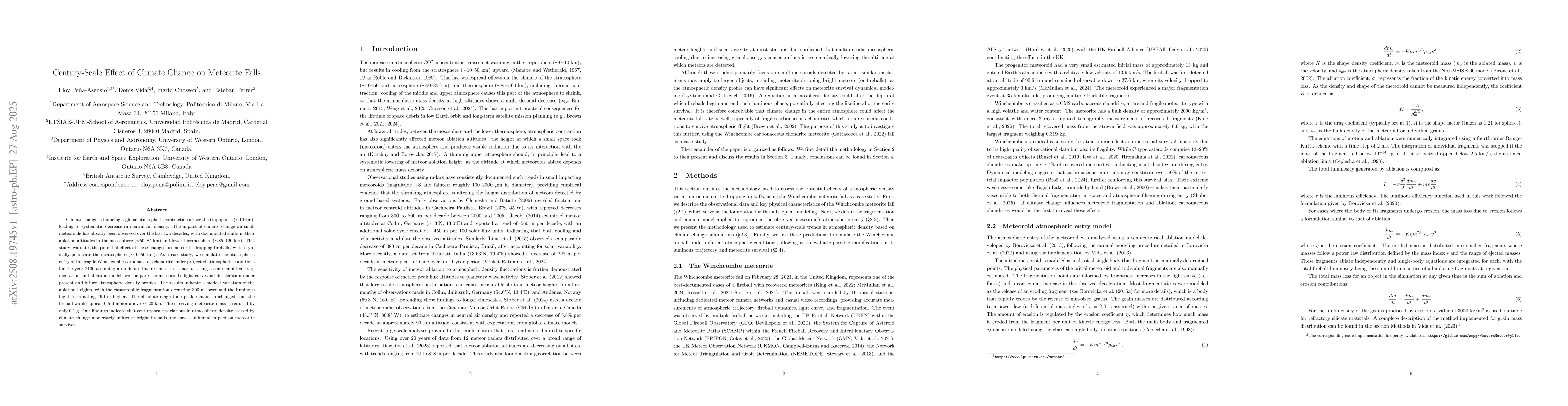 Climate change is inducing a global atmospheric contraction above the tropopause (~10 km), leading to systematic decrease in neutral air density. The impact of climate change on small meteoroids has already been observed over the last two decades, with documented shifts in their ablation altitudes in the mesosphere (~50-85 km) and lower thermosphere (~85-120 km). This study evaluates the potential effect of these changes on meteorite-dropping fireballs, which typically penetrate the stratosphere (~10-50 km). As a case study, we simulate the atmospheric entry of the fragile Winchcombe carbonaceous chondrite under projected atmospheric conditions for the year 2100 assuming a moderate future emission scenario. Using a semi-empirical fragmentation and ablation model, we compare the meteoroid's light curve and deceleration under present and future atmospheric density profiles. The results indicate a modest variation of the ablation heights, with the catastrophic fragmentation occurring 300 m lower and the luminous flight terminating 190 m higher. The absolute magnitude peak remains unchanged, but the fireball would appear 0.5 dimmer above ~120 km. The surviving meteorite mass is reduced by only 0.1 g. Our findings indicate that century-scale variations in atmospheric density caused by climate change moderately influence bright fireballs and have a minimal impact on meteorite survival.