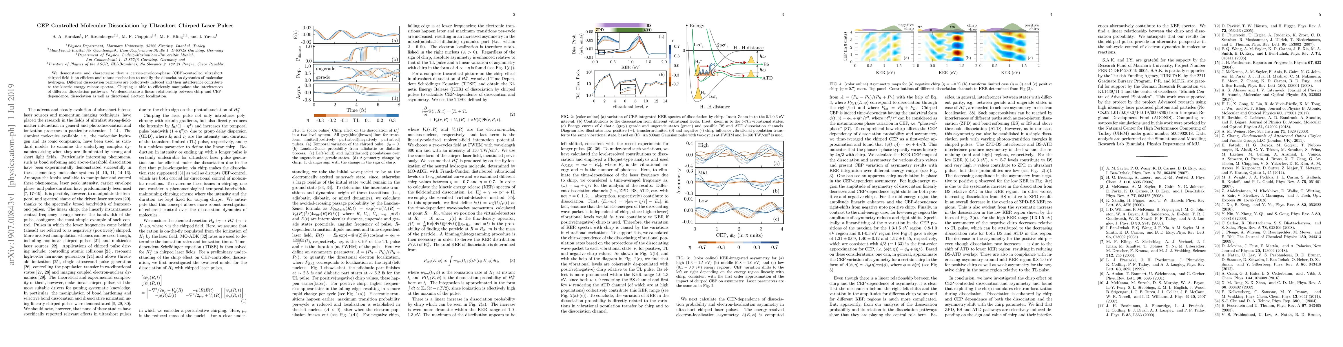 We demonstrate and characterize that a carrier-envelope-phase (CEP)-controlled ultrashortchirped field is an efficient and robust mechanism to modify the dissociation dynamics of molecularhydrogen. Different dissociation pathways are collectively induced and their interference contributeto the kinetic energy release spectra. Chirping is able to efficiently manipulate the interferencesof different dissociation pathways. We demonstrate a linear relationship between chirp and CEP-dependence, dissociation as well as directional electron localization.