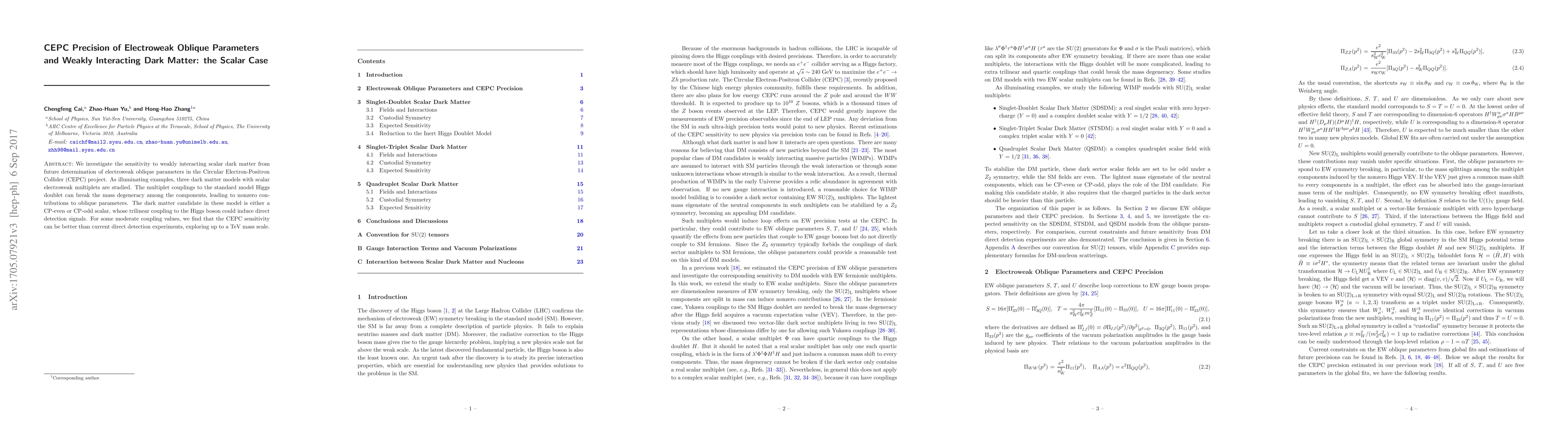 This paper examines how future CEPC measurements of electroweak oblique parameters can detect weakly interacting scalar dark matter. It studies three models where scalar dark matter candidates, either CP-even or CP-odd, can break mass degeneracy and contribute to oblique parameters, potentially surpassing current direct detection experiments in sensitivity.
