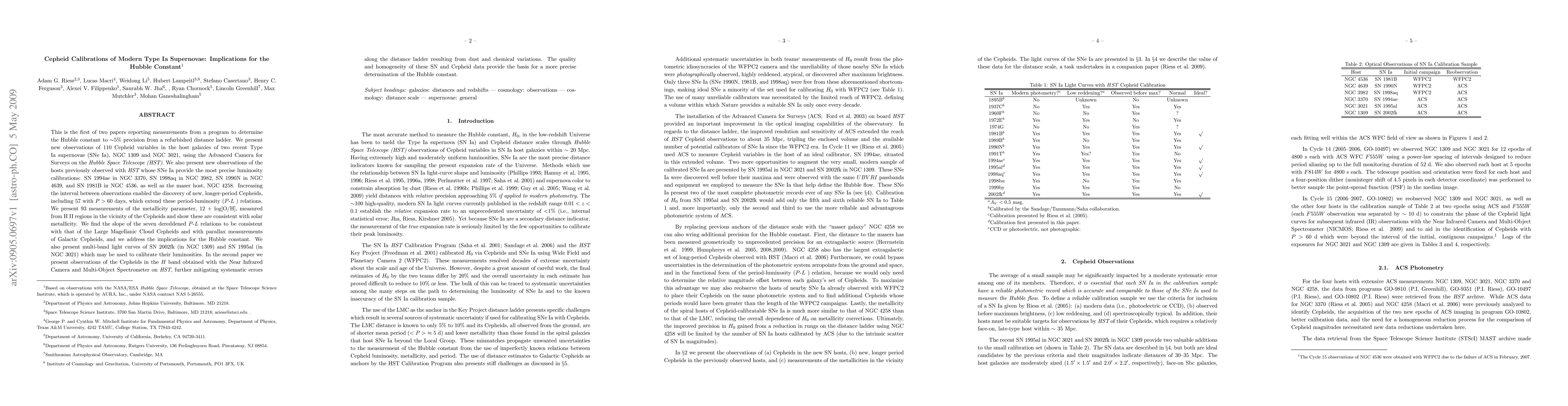 This is the first of two papers reporting measurements from a program to determine the Hubble constant to 5% precision from a refurbished distance ladder. We present new observations of 110 Cepheid variables in the host galaxies of two recent Type Ia supernovae (SNe Ia), NGC 1309 and NGC 3021, using the Advanced Camera for Surveys on the Hubble Space Telescope (HST). We also present new observations of the hosts previously observed with HST whose SNe Ia provide the most precise luminosity calibrations: SN 1994ae in NGC 3370, SN 1998aq in NGC 3982, SN 1990N in NGC 4639, and SN 1981B in NGC 4536, as well as the maser host, NGC 4258. Increasing the interval between observations enabled the discovery of new, longer-period Cepheids, including 57 with P>60 days, which extend these period-luminosity (PL) relations. We present 93 measurements of the metallicity parameter, 12 + log[O/H], measured from HII regions in the vicinity of the Cepheids and show these are consistent with solar metallicity. We find the slope of the seven dereddened PL relations to be consistent with that of the Large Magellanic Cloud Cepheids and with parallax measurements of Galactic Cepheids, and we address the implications for the Hubble constant. We also present multi-band light curves of SN 2002fk (in NGC 1309) and SN 1995al (in NGC 3021) which may be used to calibrate their luminosities. In the second paper we present observations of the Cepheids in the H-band obtained with the Near Infrared Camera and Multi-Object Spectrometer on HST, further mitigating systematic errors along the distance ladder resulting from dust and chemical variations. The quality and homogeneity of these SN and Cepheid data provide the basis for a more precise determination of the Hubble constant.