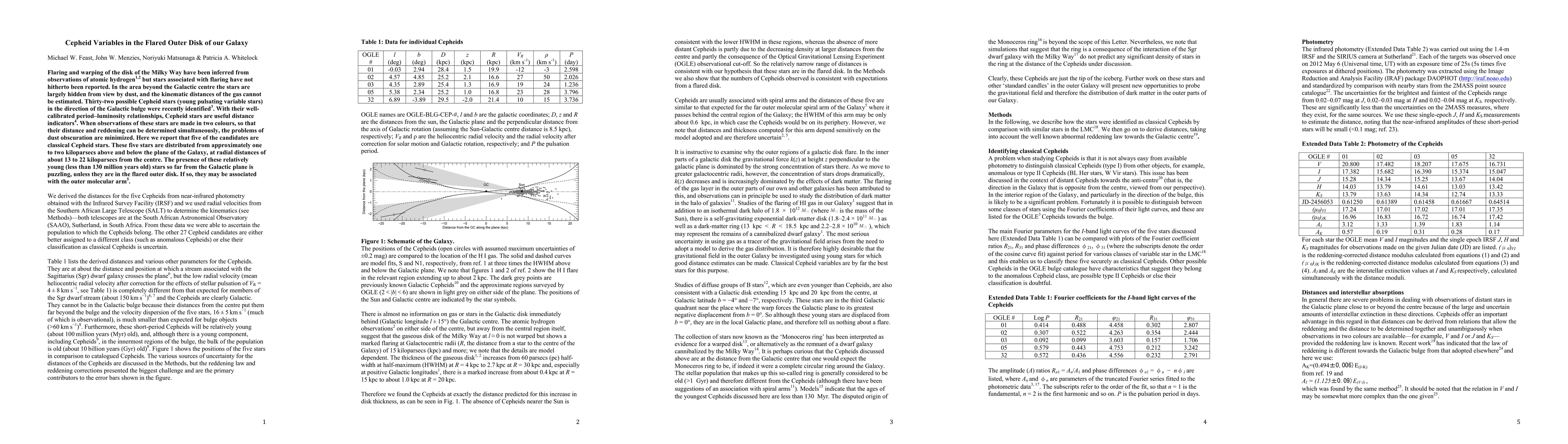 Flaring and warping of the disk of the Milky Way have been inferred from observations of atomic hydrogen, but stars associated with flaring have not hitherto been reported. In the area beyond the Galactic centre the stars are largely hidden from view by dust, and the kinematic distances of the gas cannot be estimated. Thirty-two possible Cepheid stars (young pulsating variable stars) in the direction of the Galactic bulge were recently identified. With their well-calibrated period-luminosity relationships, Cepheid stars are useful distance indicators. When observations of these stars are made in two colours, so that their distance and reddening can be determined simultaneously, the problems of dust obscuration are minimized. Here we report that five of the candidates are classical Cepheid stars. These five stars are distributed from approximately one to two kiloparsecs above and below the plane of the Galaxy, at radial distances of about 13 to 22 kiloparsecs from the centre. The presence of these relatively young (less than 130 million years old) stars so far from the Galactic plane is puzzling, unless they are in the flared outer disk. If so, they may be associated with the outer molecular arm.