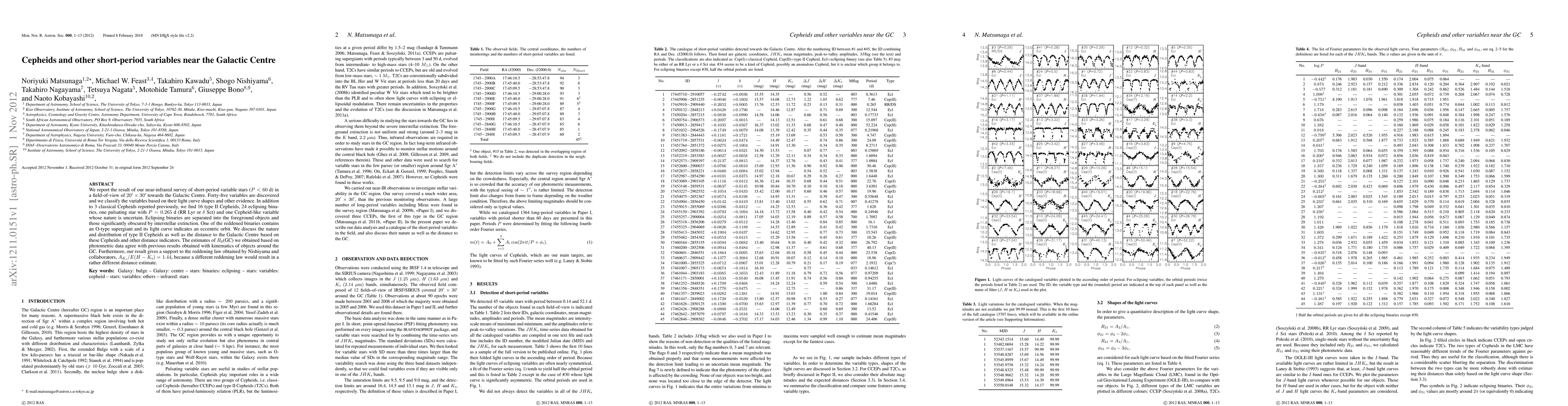 This paper reports on a near-infrared survey of short-period variable stars near the Galactic Centre, discovering 45 variables including 16 type II Cepheids and 24 eclipsing binaries. The study supports previous estimates of the Galactic Centre's distance and validates a specific reddening law.