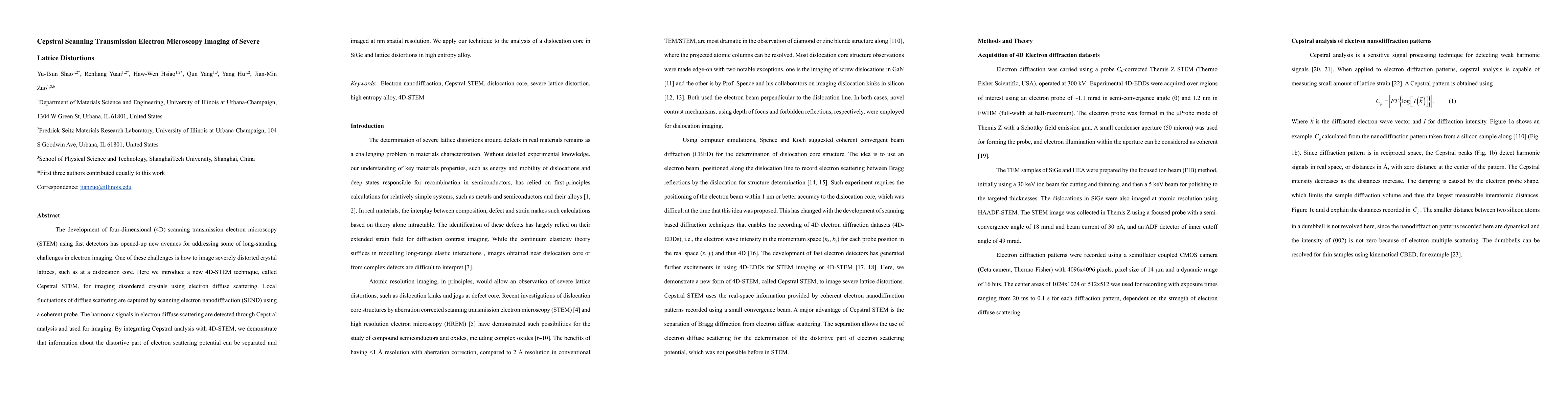 This paper introduces Cepstral Scanning Transmission Electron Microscopy (STEM) for imaging severe lattice distortions, such as dislocation cores, using electron diffuse scattering. The technique leverages 4D-STEM and Cepstral analysis to separate and visualize the distortive part of the electron scattering potential at nanometer resolution.