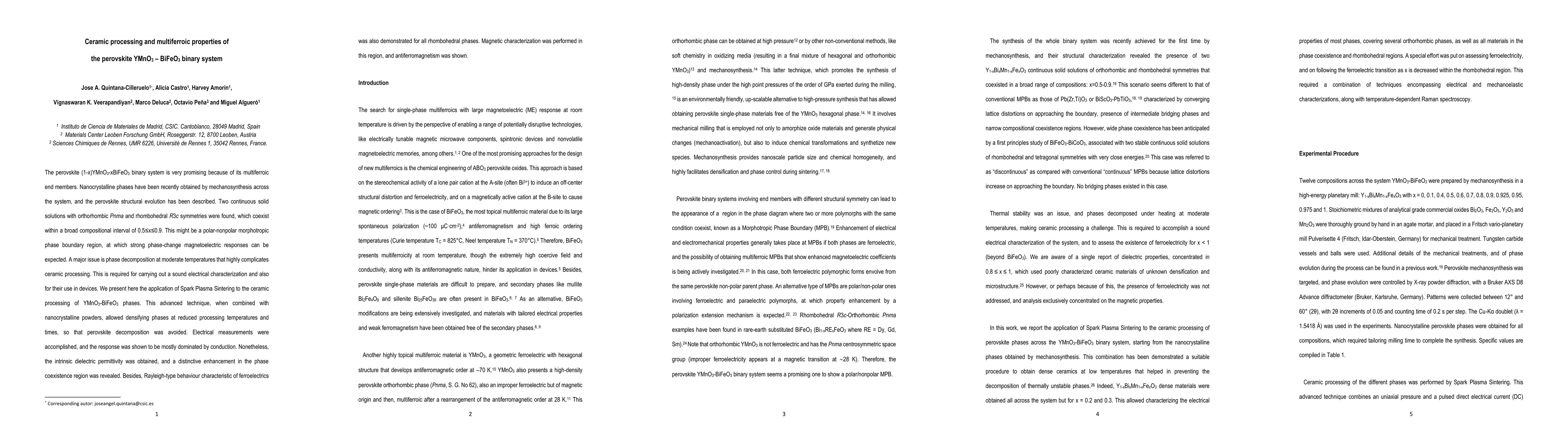 The perovskite (1-x)YMnO$_3$-xBiFeO$_3$ binary system is very promising because of its multiferroic end members. Nanocrystalline phases have been recently obtained by mechanosynthesis across the system, and the perovskite structural evolution has been described. Two continuous solid solutions with orthorhombic Pnma and rhombohedral R3c symmetries were found, which coexist within a broad compositional interval of 0.5 < x < 0.9. This might be a polar-nonpolar morphotropic phase boundary region, at which strong phase-change magnetoelectric responses can be expected. A major issue is phase decomposition at moderate temperatures that highly complicates ceramic processing. This is required for carrying out a sound electrical characterization and also for their use in devices. We present here the application of Spark Plasma Sintering to the ceramic processing of YMnO$_3$-BiFeO$_3$ phases. This advanced technique, when combined with nanocrystalline powders, allowed densifying phases at reduced processing temperatures and times, so that perovskite decomposition was avoided. Electrical measurements were accomplished, and the response was shown to be mostly dominated by conduction. Nonetheless, the intrinsic dielectric permittivity was obtained, and a distinctive enhancement in the phase coexistence region was revealed. Besides, Rayleigh-type behaviour characteristic of ferroelectrics was also demonstrated for all rhombohedral phases. Magnetic characterization was performed in this region, and antiferromagnetism was shown.