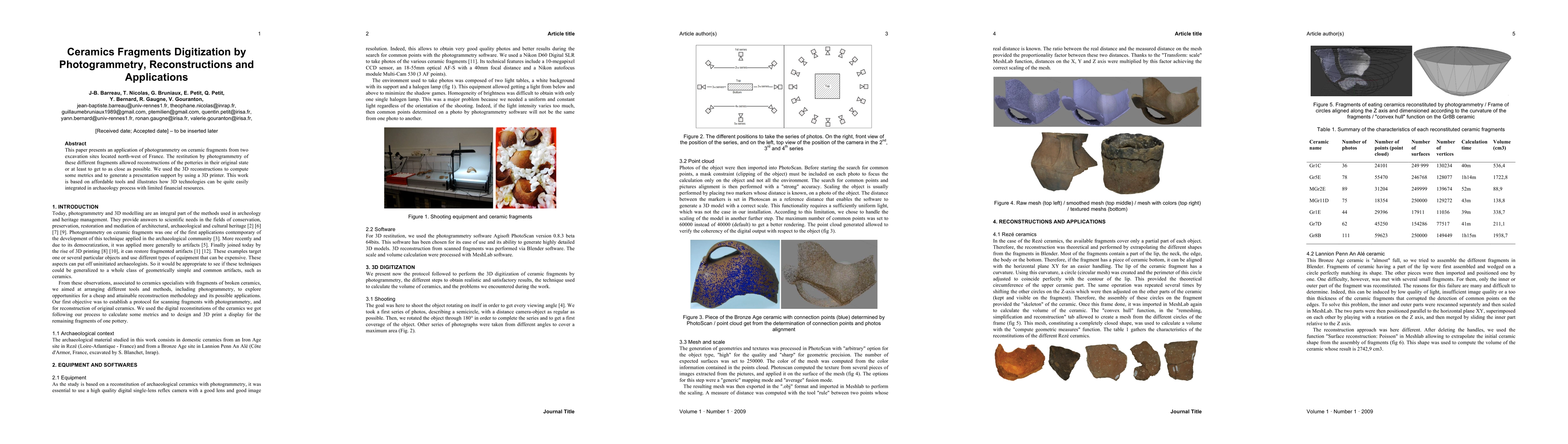 This paper presents an application of photogrammetry on ceramic fragments from two excavation sites located north-west of France. The restitution by photogrammetry of these different fragments allowed reconstructions of the potteries in their original state or at least to get to as close as possible. We used the 3D reconstructions to compute some metrics and to generate a presentation support by using a 3D printer. This work is based on affordable tools and illustrates how 3D technologies can be quite easily integrated in archaeology process with limited financial resources. 1. INTRODUCTION Today, photogrammetry and 3D modelling are an integral part of the methods used in archeology and heritage management. They provide answers to scientific needs in the fields of conservation, preservation, restoration and mediation of architectural, archaeological and cultural heritage [2] [6] [7] [9]. Photogrammetry on ceramic fragments was one of the first applications contemporary of the development of this technique applied in the archaeological community [3]. More recently and due to its democratization, it was applied more generally to artifacts [5]. Finally joined today by the rise of 3D printing [8] [10], it can restore fragmented artifacts [1] [12]. These examples target one or several particular objects and use different types of equipment that can be expensive. These aspects can put off uninitiated archaeologists. So it would be appropriate to see if these techniques could be generalized to a whole class of geometrically simple and common artifacts, such as ceramics. From these observations, associated to ceramics specialists with fragments of broken ceramics, we aimed at arranging different tools and methods, including photogrammetry, to explore opportunities for a cheap and attainable reconstruction methodology and its possible applications. Our first objective was to establish a protocol for scanning fragments with photogrammetry, and for reconstruction of original ceramics. We used the digital reconstitutions of the ceramics we got following our process to calculate some metrics and to design and 3D print a display for the remaining fragments of one pottery.