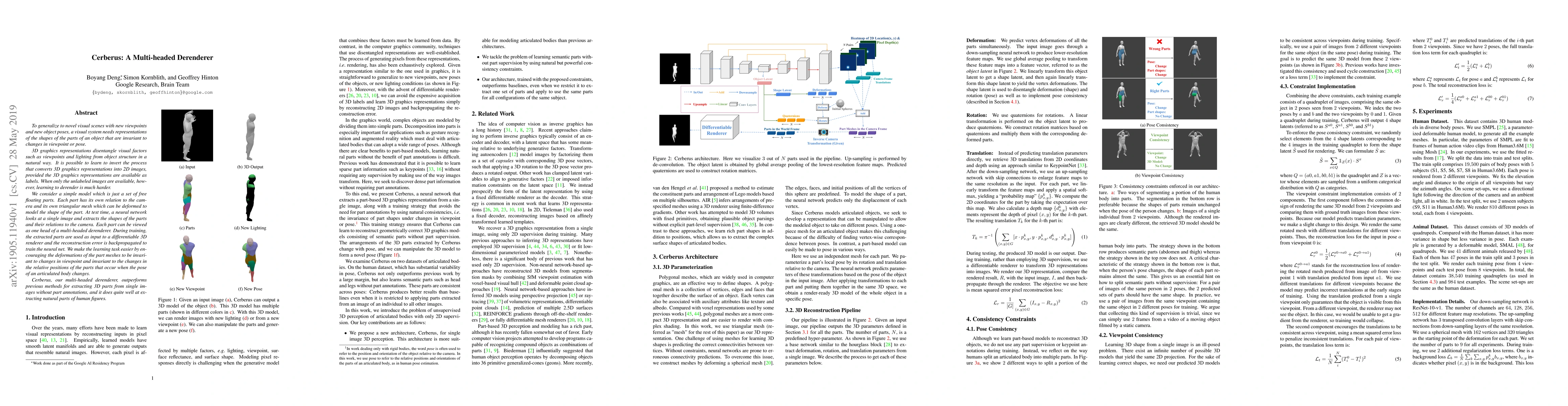 Cerberus is a multi-headed derenderer that extracts 3D parts from single images, modeling each part's shape and relation to the camera. It achieves better performance than previous methods by training with invariant deformations of part meshes to viewpoint and pose changes.