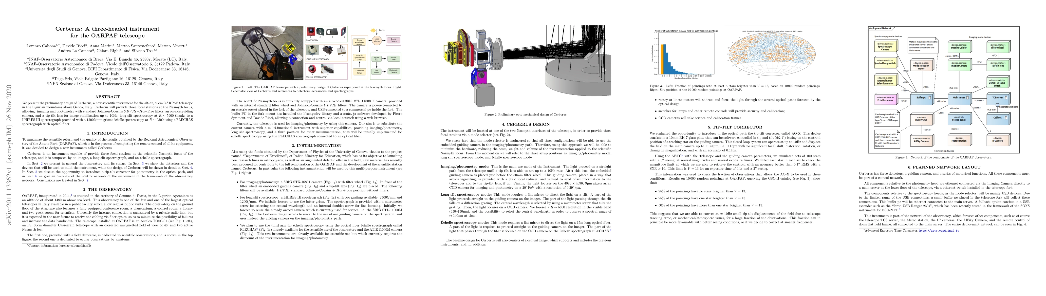 Cerberus is a new scientific instrument for the OARPAF telescope in Italy, featuring three focal stations for imaging, photometry, guiding, and spectroscopy, including a high-resolution spectrograph for detailed astronomical observations.