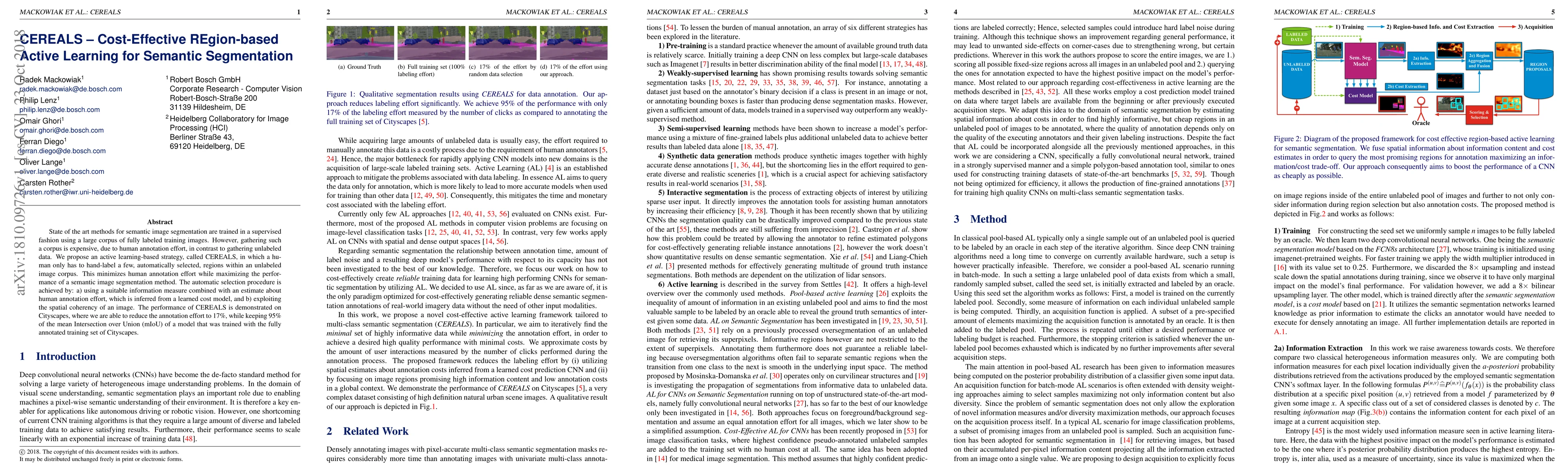 The paper introduces CEREALS, an active learning strategy for semantic image segmentation that significantly reduces human annotation effort. By hand-labeling only a few strategically selected regions in unlabeled images, CEREALS maintains 95% of the segmentation model's performance compared to full annotation on Cityscapes, achieving this with just 17% of the labeling workload.