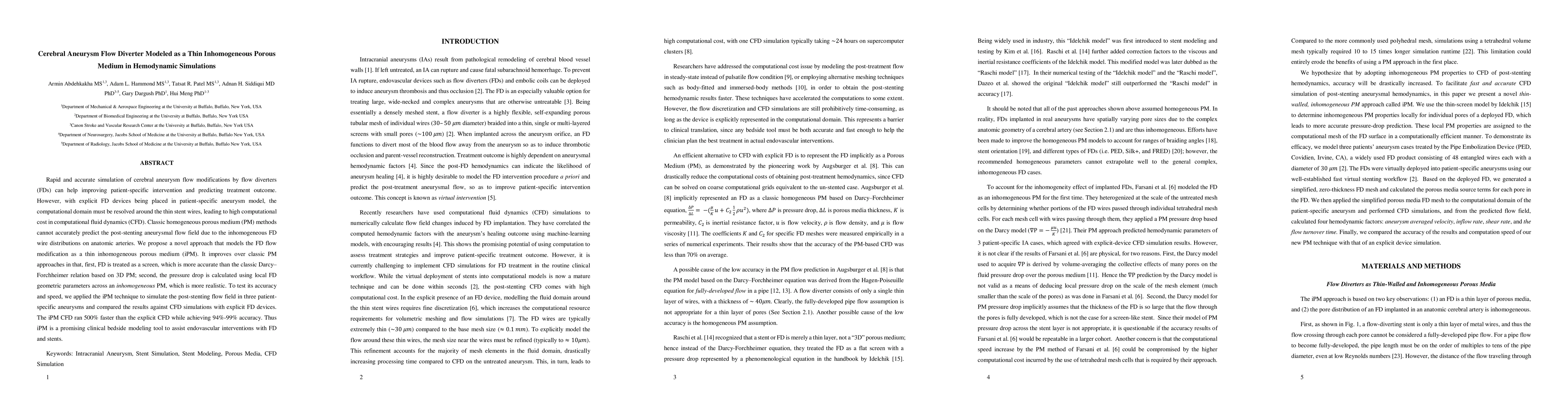 This paper proposes a novel thin inhomogeneous porous medium (iPM) model to simulate cerebral aneurysm flow modifications by flow diverters, achieving significant computational speedups (500%) compared to explicit CFD simulations while maintaining 94%-99% accuracy. The iPM approach treats the flow diverter more accurately than traditional methods, offering a promising tool for patient-specific endovascular interventions.