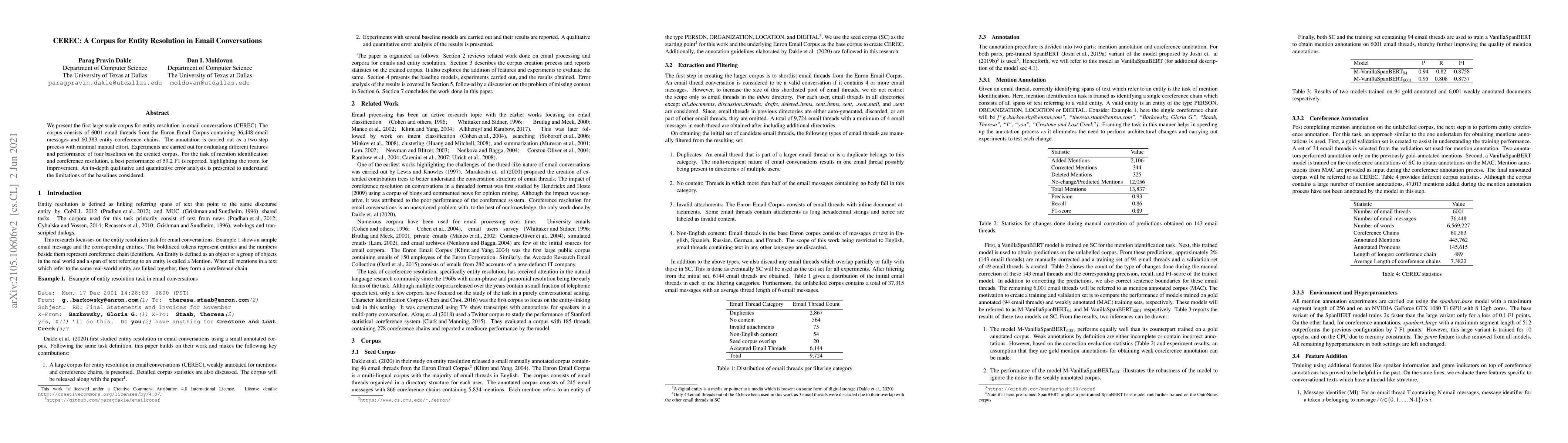 The CEREC corpus, comprising 6001 email threads from Enron, facilitates research in entity resolution within email conversations, achieving a best F1 score of 59.2 for mention identification and coreference resolution, while highlighting areas for improvement through error analysis.