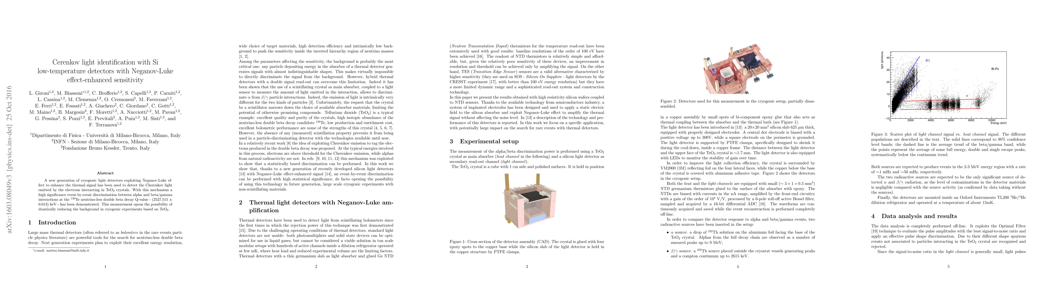 This paper presents cryogenic light detectors utilizing the Neganov-Luke effect to enhance thermal signal detection, successfully identifying Cherenkov light from electron interactions in TeO$_2$ crystals. The method enables significant discrimination between alpha and beta/gamma interactions, potentially reducing background noise in TeO$_2$-based cryogenic experiments.