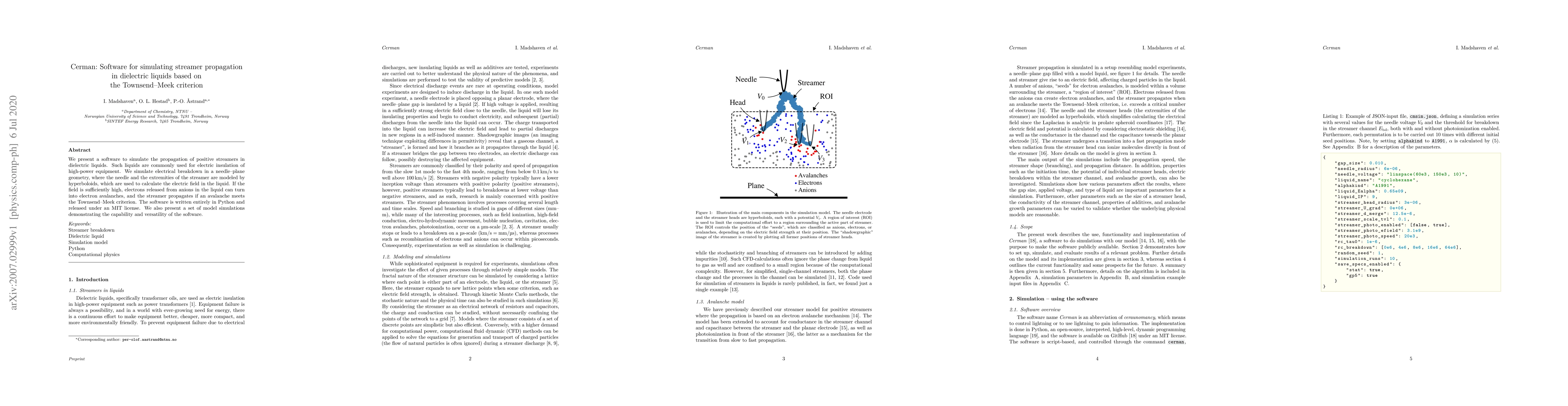 The paper introduces Cerman, a Python-based software for simulating the propagation of positive streamers in dielectric liquids, using the Townsend-Meek criterion to model electrical breakdown in needle-plane geometry. The software demonstrates its capability through various model simulations.