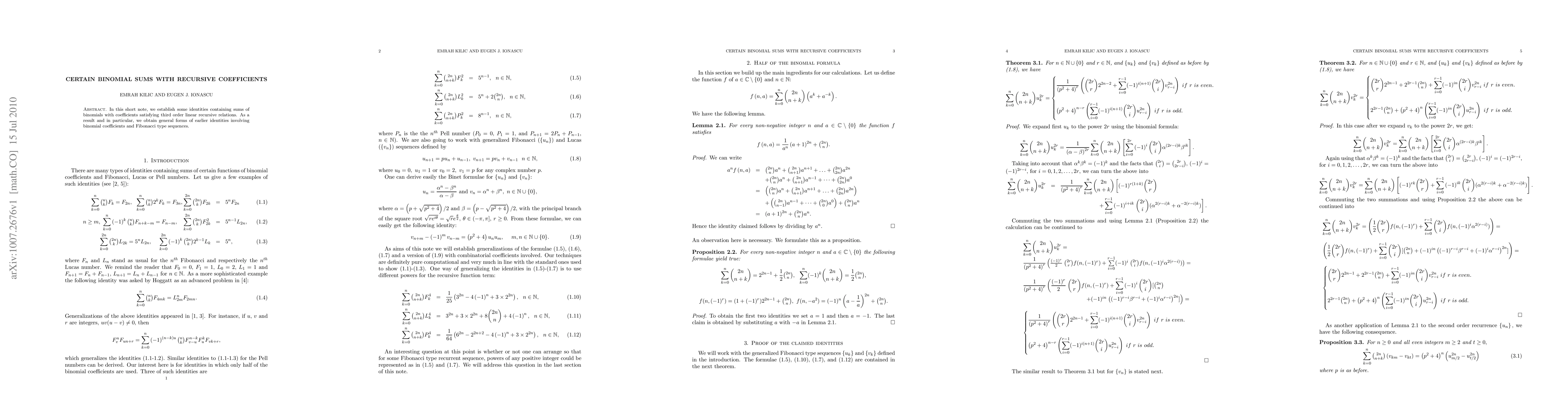 This paper establishes identities for binomial sums where coefficients follow a third-order linear recursive relation, generalizing earlier identities involving binomial coefficients and sequences akin to Fibonacci numbers. The results provide new forms for these previously known identities.