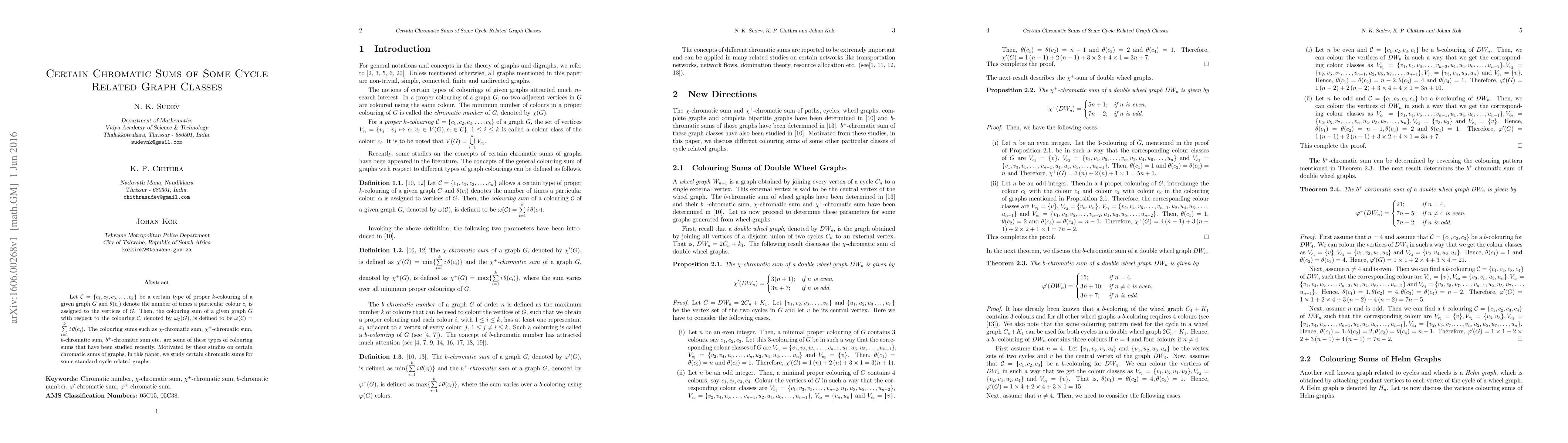This paper investigates specific chromatic sums for particular $k$-colourings of standard cycle-related graphs, defining these sums as weighted counts of colour assignments. It builds on recent studies of various chromatic sums to explore their properties in cycle-related graph classes.