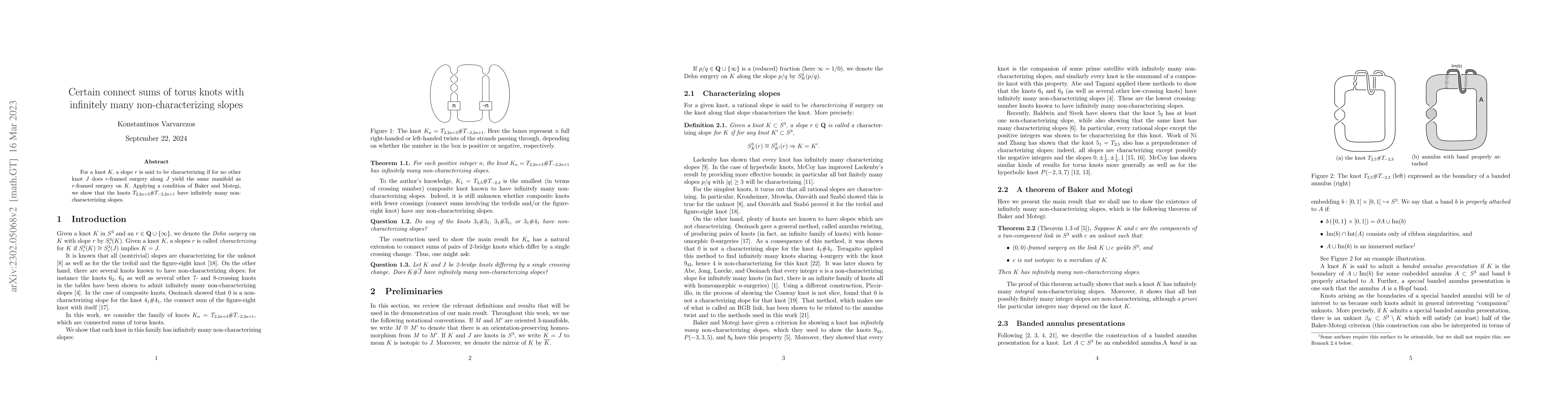 This paper demonstrates that the connect sum of specific torus knots, $T_{2,2n+3}$ and $T_{-2,2n+1}$, possesses infinitely many slopes that do not uniquely characterize them, using a condition from Baker and Motegi. These non-characterizing slopes result in the same manifold through framed surgery regardless of the knot.