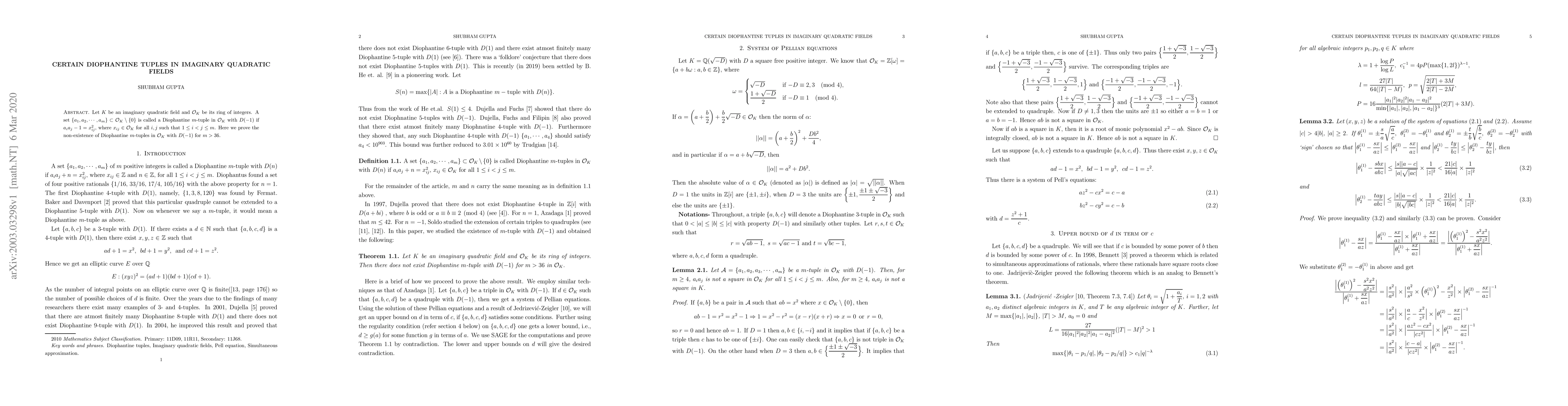 This paper proves that there are no Diophantine $m$-tuples in the ring of integers of an imaginary quadratic field $\mathcal{O}_K$ with $D(-1)$ for $m > 36$, where a Diophantine $m$-tuple satisfies $a_ia_j - 1 = x_{ij}^2$ for all $1 \leq i < j \leq m$.