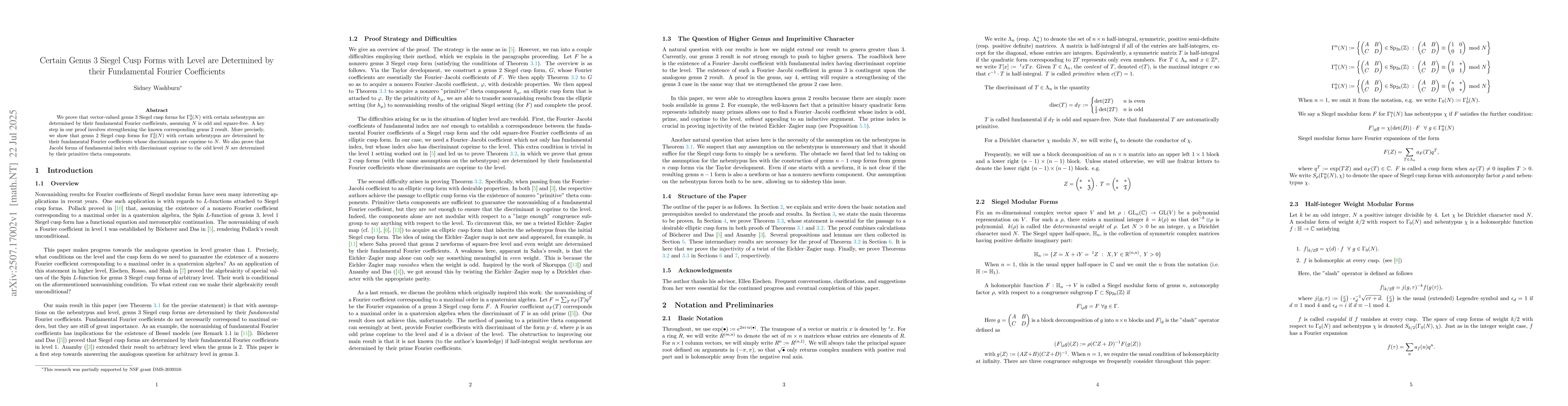 We prove that vector-valued genus 3 Siegel cusp forms for $\Gamma_0^3(N)$ with certain nebentypus are determined by their fundamental Fourier coefficients, assuming $N$ is odd and square-free. A key step in our proof involves strengthening the known corresponding genus 2 result. More precisely, we show that genus 2 Siegel cusp forms for $\Gamma_0^2(N)$ with certain nebentypus are determined by their fundamental Fourier coefficients whose discriminants are coprime to $N$. We also prove that Jacobi forms of fundamental index with discriminant coprime to the odd level $N$ are determined by their primitive theta components.