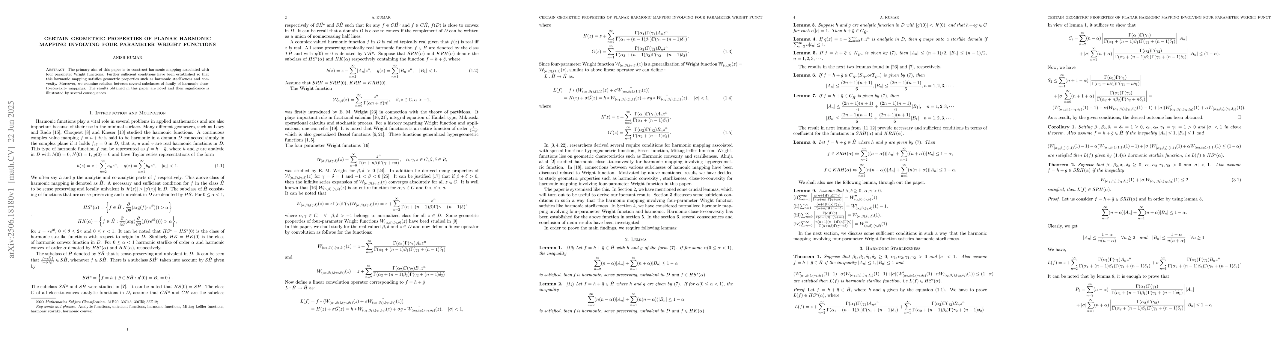 The primary aim of this paper is to construct harmonic mapping associated with four parameter Wright functions. Further sufficient conditions have been established so that this harmonic mapping satisfies geometric properties such as harmonic starlikeness and convexity. Moreover, we examine relation between several subclasses of family of harmonic close-to-convexity mappings. The results obtained in this paper are novel and their significance is illustrated by several consequences.