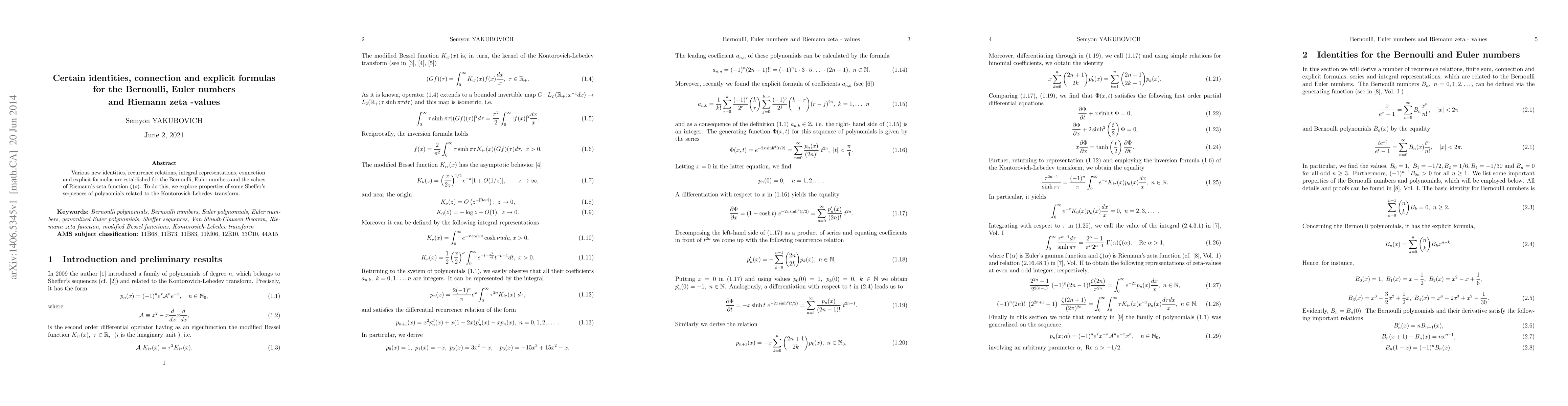 Various new identities, recurrence relations, integral representations, connection and explicit formulas are established for the Bernoulli, Euler numbers and the values of Riemann's zeta function. To do this, we explore properties of some Sheffer's sequences of polynomials related to the Kontorovich-Lebedev transform.