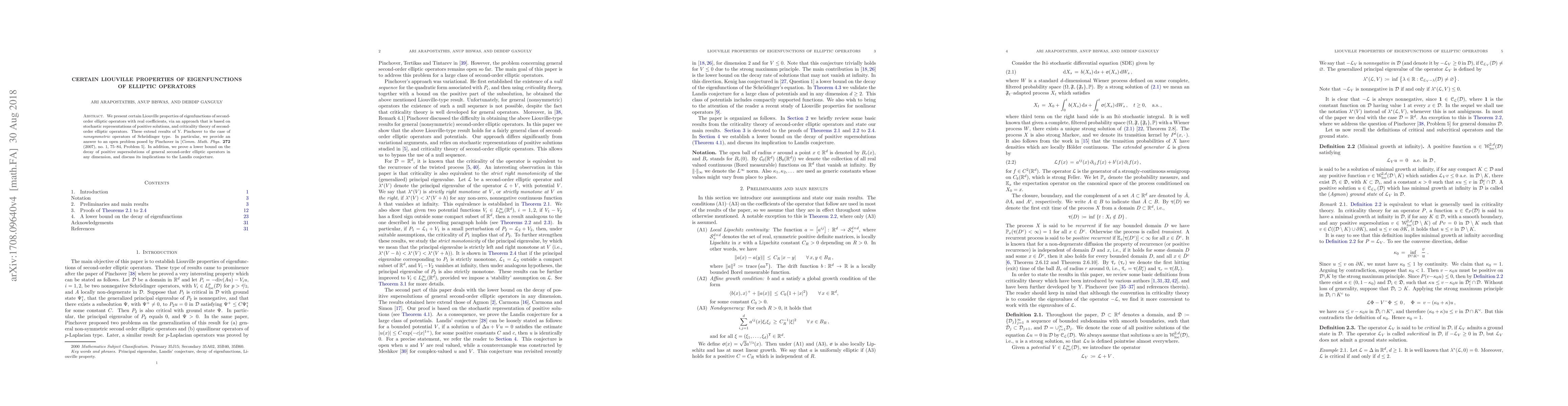 This paper explores Liouville properties of eigenfunctions for second-order elliptic operators with real coefficients, extending previous results for symmetric operators to nonsymmetric ones. It also provides a lower bound on the decay of positive supersolutions and discusses implications for the Landis conjecture.