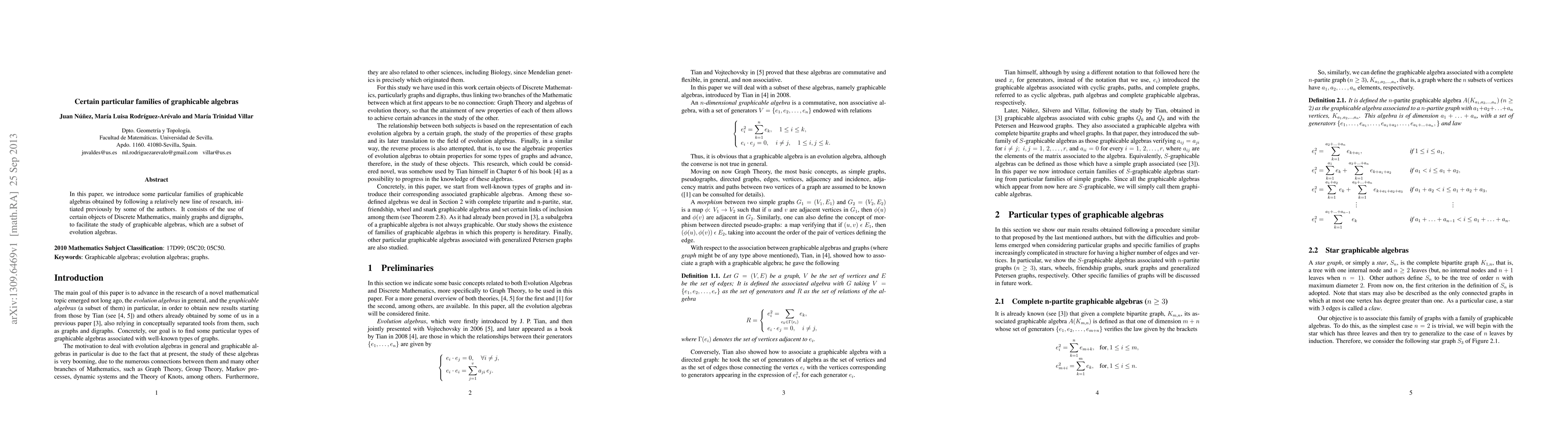 In this paper, we introduce some particular families of graphicable algebras obtained by following a relatively new line of research, initiated previously by some of the authors. It consists of the use of certain objects of Discrete Mathematics, mainly graphs and digraphs, to facilitate the study of graphicable algebras, which are a subset of evolution algebras.