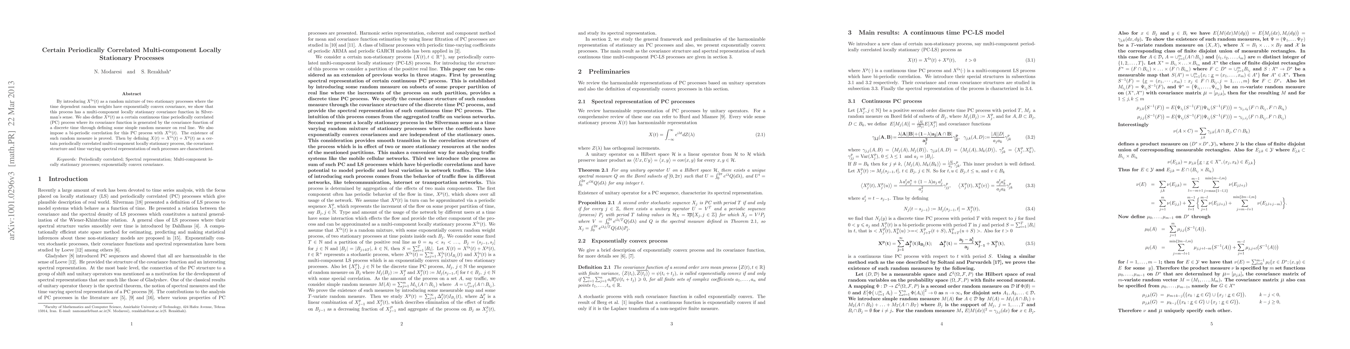 By introducing $X^{ls}(t)$ as a random mixture of two stationary processes where the time dependent random weights have exponentially convex covariance, we show that this process has a multi-component locally stationary covariance function in Silverman's sense. We also define $X^p(t)$ as a certain continuous time periodically correlated (PC) process where its covariance function is generated by the covariance function of a discrete time through defining some simple random measure on real line. We also impose a bi-periodic correlation for this PC process with $X^{ls}(t)$. The existence of such random measure is proved. Then by defining $X(t)=X^{ls}(t)+X^p(t)$ as a certain periodically correlated multi-component locally stationary process, the covariance structure and time varying spectral representation of such processes are characterized.