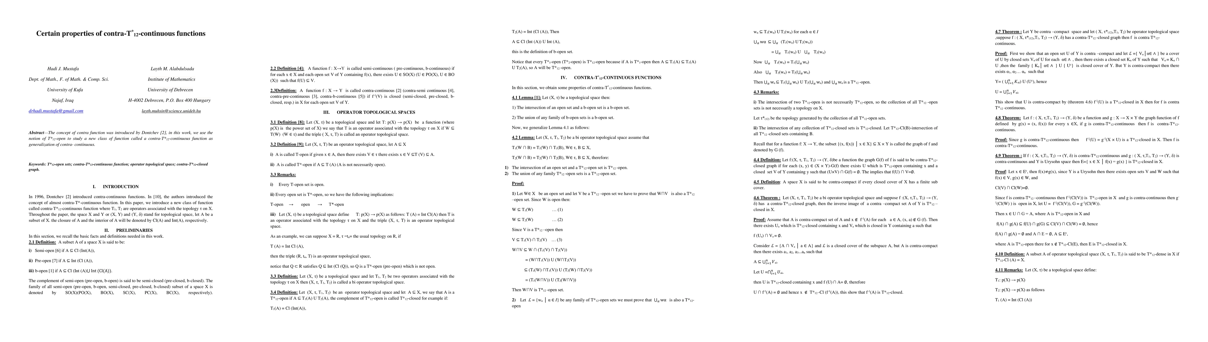 This paper introduces contra-T*12-continuous functions as a generalization of contra-continuous functions, exploring their properties using the notion of T*12-open. The study focuses on understanding this new class of functions and its implications in mathematical analysis.