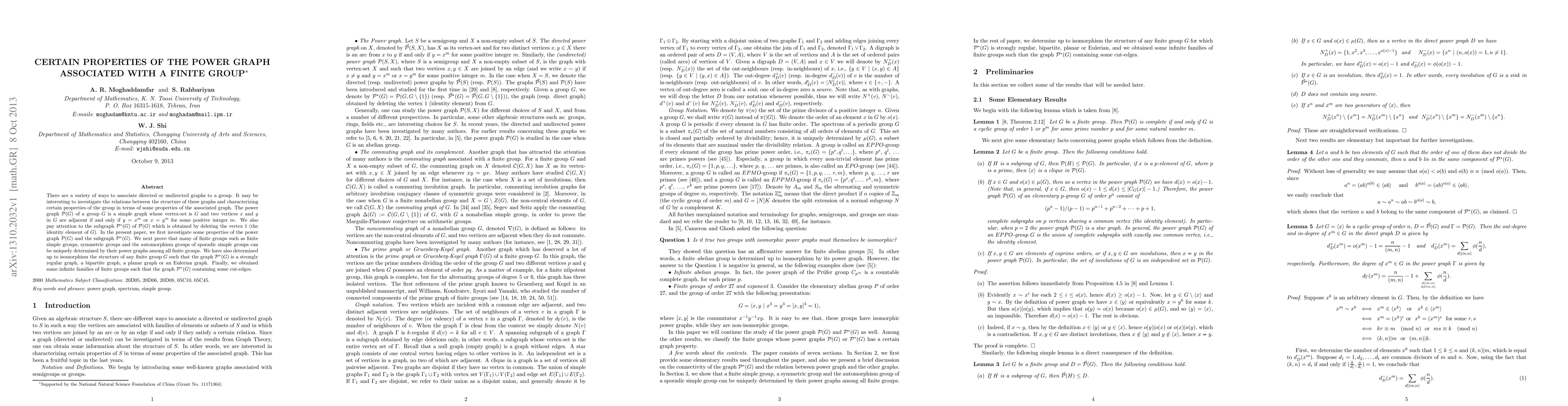 There are a variety of ways to associate directed or undirected graphs to a group. It may be interesting to investigate the relations between the structure of these graphs and characterizing certain properties of the group in terms of some properties of the associated graph. The power graph $\mathcal{P}(G)$ of a group $G$ is a simple graph whose vertex-set is $G$ and two vertices $x$ and $y$ in $G$ are adjacent if and only if $y=x^m$ or $x=y^m$ for some positive integer $m$. We also pay attention to the subgraph $\mathcal{P}^\ast(G)$ of $\mathcal{P}(G)$ which is obtained by deleting the vertex 1 (the identity element of $G$). In the present paper, we first investigate some properties of the power graph $\mathcal{P}(G)$ and the subgraph $\mathcal{P}^\ast(G)$. We next prove that many of finite groups such as finite simple groups, symmetric groups and the automorphism groups of sporadic simple groups can be uniquely determined by their power graphs among all finite groups. We have also determined up to isomorphism the structure of any finite group $G$ such that the graph $\mathcal{P}^\ast(G)$ is a strongly regular graph, a bipartite graph, a planar graph or an Eulerian graph. Finally, we obtained some infinite families of finite groups such that the graph $\mathcal{P}^\ast(G)$ containing some cut-edges.