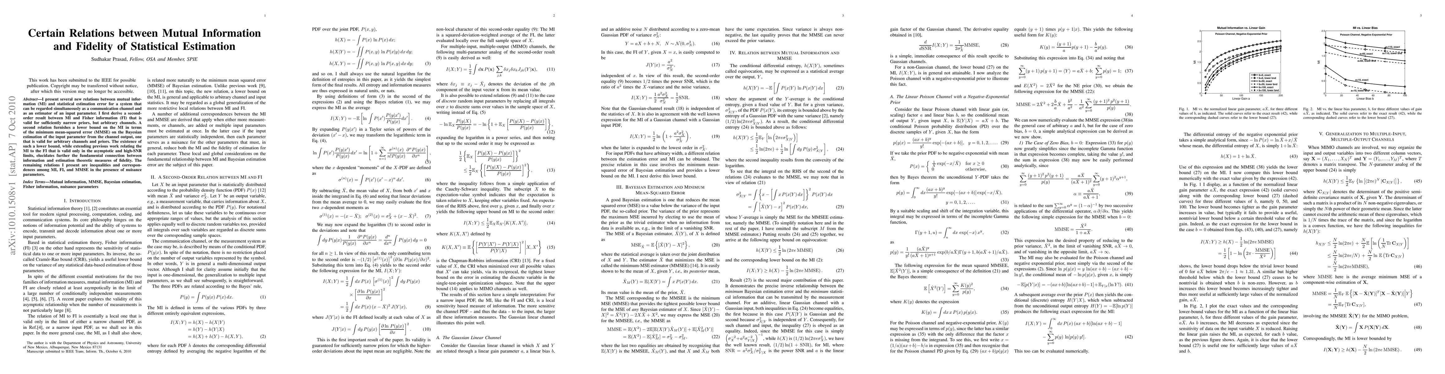 I present several new relations between mutual information (MI) and statistical estimation error for a system that can be regarded simultaneously as a communication channel and as an estimator of an input parameter. I first derive a second-order result between MI and Fisher information (FI) that is valid for sufficiently narrow priors, but arbitrary channels. A second relation furnishes a lower bound on the MI in terms of the minimum mean-squared error (MMSE) on the Bayesian estimation of the input parameter from the channel output, one that is valid for arbitrary channels and priors. The existence of such a lower bound, while extending previous work relating the MI to the FI that is valid only in the asymptotic and high-SNR limits, elucidates further the fundamental connection between information and estimation theoretic measures of fidelity. The remaining relations I present are inequalities and correspondences among MI, FI, and MMSE in the presence of nuisance parameters.
