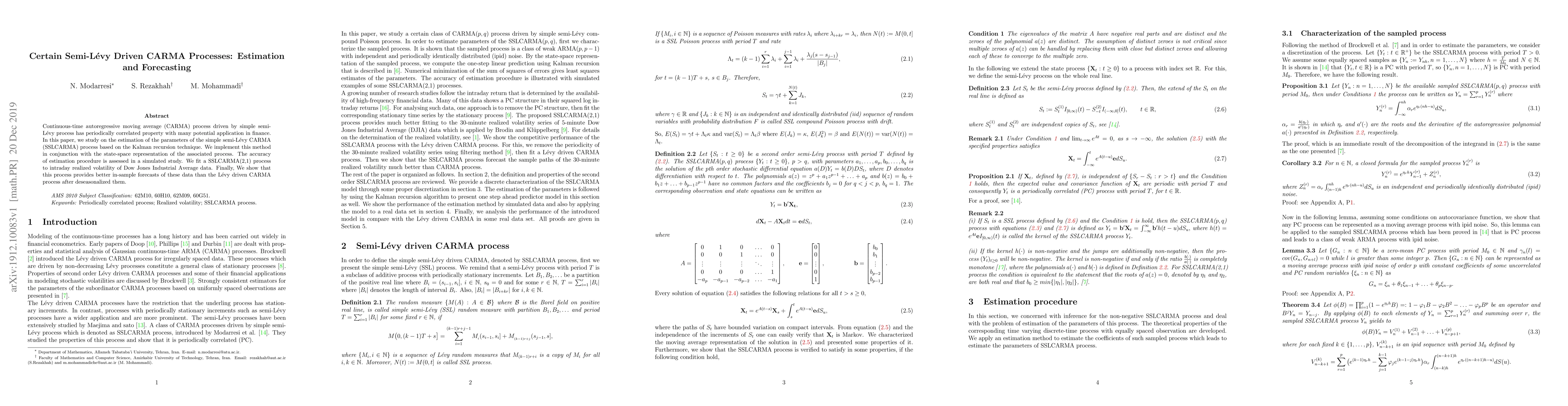 Continuous-time autoregressive moving average (CARMA) process driven by simple semi-L\'evy process has periodically correlated property with many potential application in finance. In this paper, we study on the estimation of the parameters of the simple semi-L\'evy CARMA (SSLCARMA) process based on the Kalman recursion technique. We implement this method in conjunction with the state-space representation of the associated process. The accuracy of estimation procedure is assessed in a simulated study. We fit a SSLCARMA(2,1) process to intraday realized volatility of Dow Jones Industrial Average data. Finally, We show that this process provides better in-sample forecasts of these data than the L\'evy driven CARMA process after de-seasonalized them.
