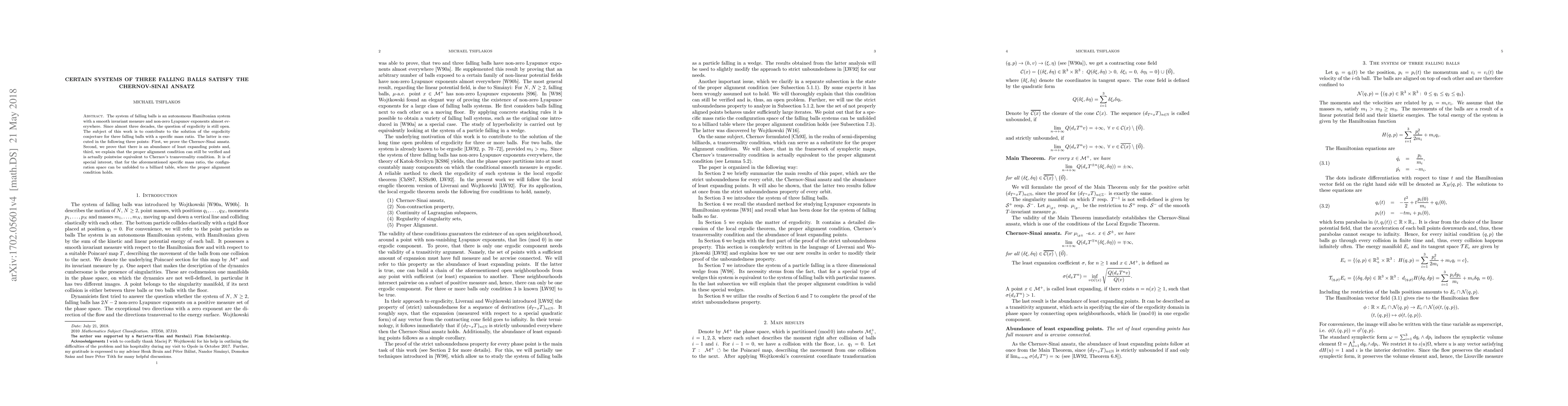 This research proves the Chernov-Sinai ansatz for a specific mass ratio in the three falling balls system, establishes abundance of least expanding points, and shows alignment condition equivalence to Chernov's transversality condition. The configuration space can be unfolded into a billiard table for this mass ratio, advancing the ergodicity conjecture solution.