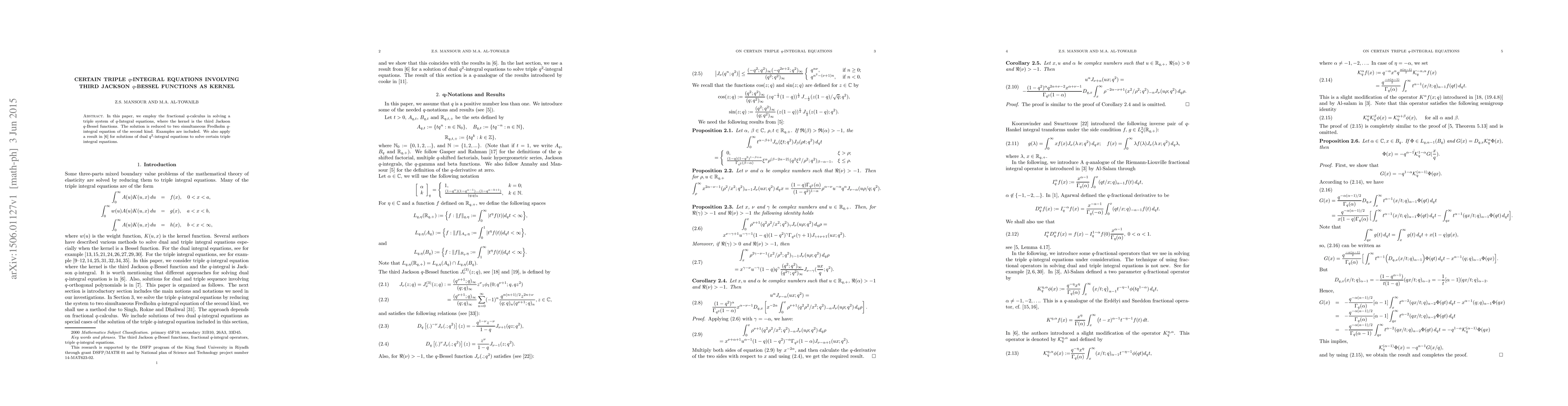 In this paper, we employ the fractional $q$-calculus in solving a triple system of $q$-Integral equations, where the kernel is the third Jackson $q$-Bessel functions. The solution is reduced to two simultaneous Fredholm $q$-integral equation of the second kind. Examples are included. We also apply a result in~[Pacific J. Math. \textbf{275}(1) (2015)63--102] for solutions of dual $q^2$-integral equations to solve certain triple integral equations.