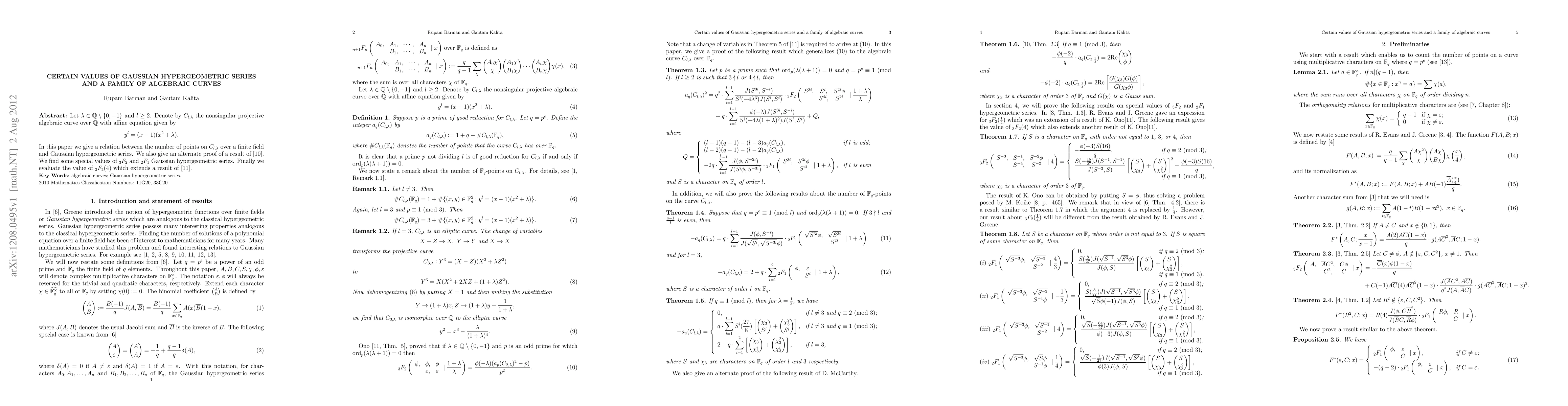 This paper explores the relationship between Gaussian hypergeometric series and a specific family of algebraic curves defined by $y^l=(x-1)(x^2+\lambda)$. It provides a connection between the number of points on these curves over finite fields and special values of Gaussian hypergeometric series, including an evaluation of ${_{3}}F_2(4)$.