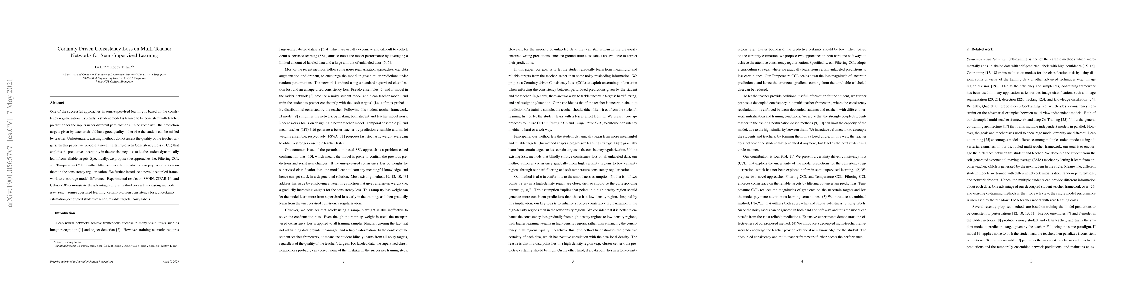 The paper proposes a novel Certainty-driven Consistency Loss (CCL) for semi-supervised learning, which uses predictive uncertainty to help student models learn from reliable teacher predictions. It introduces two approaches, Filtering CCL and Temperature CCL, to manage uncertain predictions. Experimental results on SVHN, CIFAR-10, and CIFAR-100 datasets show the effectiveness of the proposed method over existing ones.