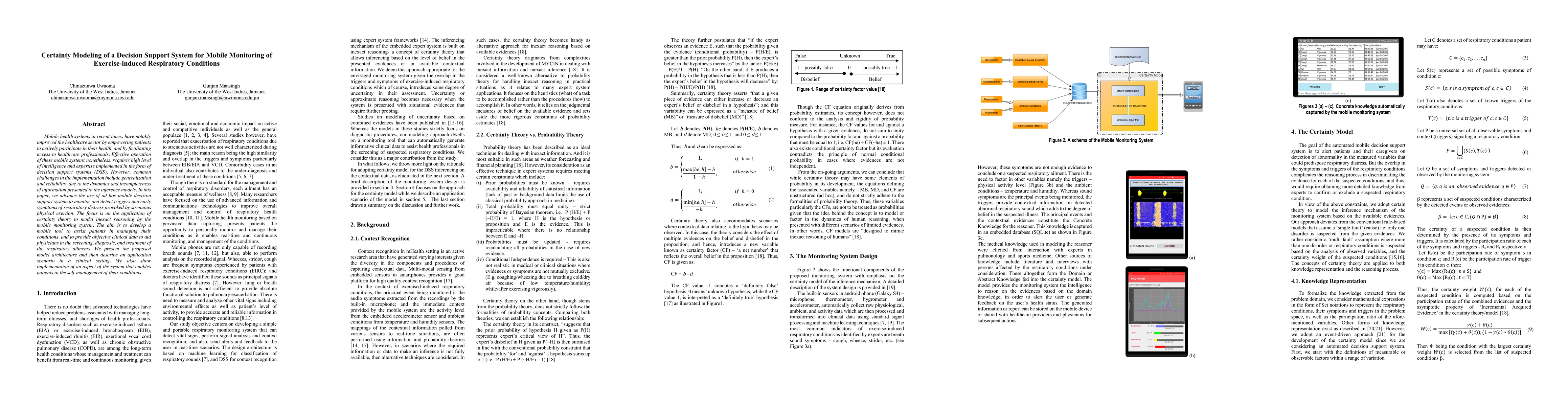 This paper proposes a mobile decision support system using certainty theory to monitor respiratory conditions triggered by exercise. It aims to help patients self-manage and provide clinicians with objective data for diagnosis and treatment, addressing challenges of generalization and reliability in mobile health systems.