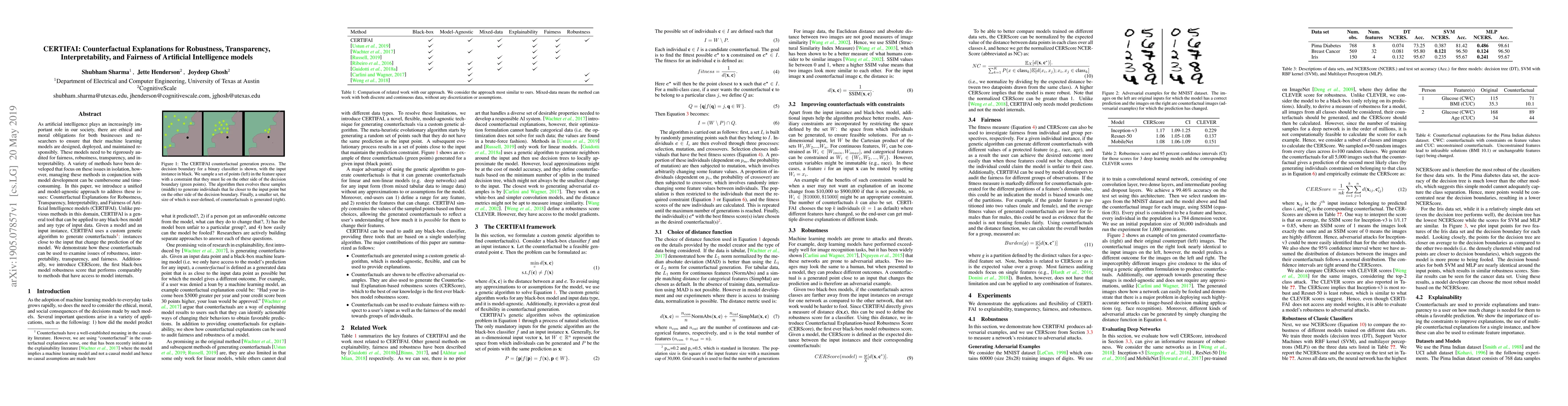As artificial intelligence plays an increasingly important role in our society, there are ethical and moral obligations for both businesses and researchers to ensure that their machine learning models are designed, deployed, and maintained responsibly. These models need to be rigorously audited for fairness, robustness, transparency, and interpretability. A variety of methods have been developed that focus on these issues in isolation, however, managing these methods in conjunction with model development can be cumbersome and timeconsuming. In this paper, we introduce a unified and model-agnostic approach to address these issues: Counterfactual Explanations for Robustness, Transparency, Interpretability, and Fairness of Artificial Intelligence models (CERTIFAI). Unlike previous methods in this domain, CERTIFAI is a general tool that can be applied to any black-box model and any type of input data. Given a model and an input instance, CERTIFAI uses a custom genetic algorithm to generate counterfactuals: instances close to the input that change the prediction of the model. We demonstrate how these counterfactuals can be used to examine issues of robustness, interpretability, transparency, and fairness. Additionally, we introduce CERScore, the first black-box model robustness score that performs comparably to methods that have access to model internals.