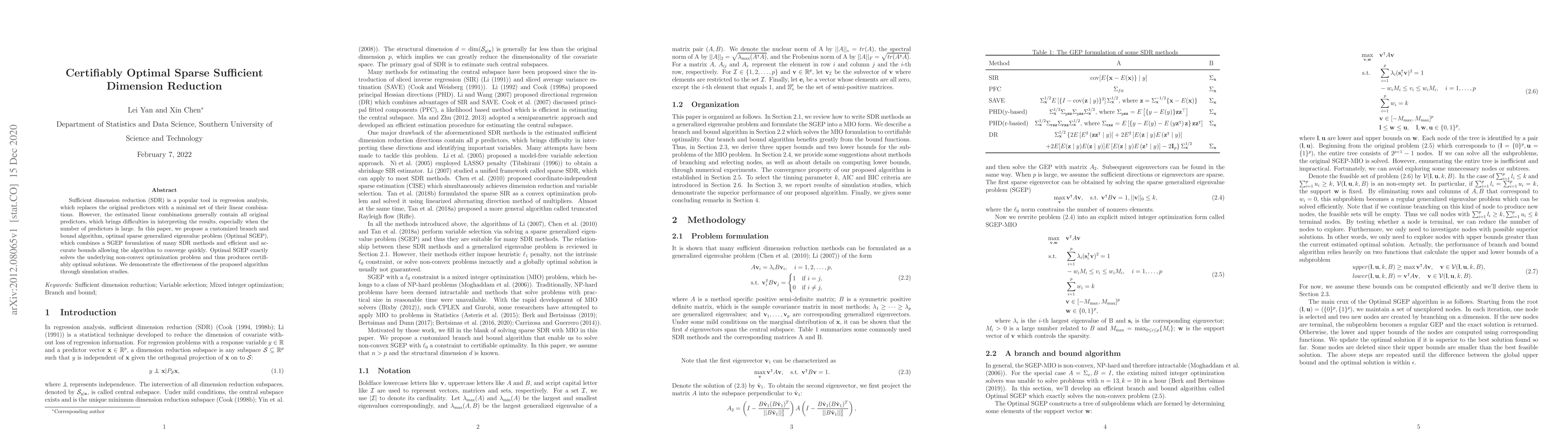 Sufficient dimension reduction (SDR) is a popular tool in regression analysis, which replaces the original predictors with a minimal set of their linear combinations. However, the estimated linear combinations generally contain all original predictors, which brings difficulties in interpreting the results, especially when the number of predictors is large. In this paper, we propose a customized branch and bound algorithm, optimal sparse generalized eigenvalue problem (Optimal SGEP), which combines a SGEP formulation of many SDR methods and efficient and accurate bounds allowing the algorithm to converge quickly. Optimal SGEP exactly solves the underlying non-convex optimization problem and thus produces certifiably optimal solutions. We demonstrate the effectiveness of the proposed algorithm through simulation studies.