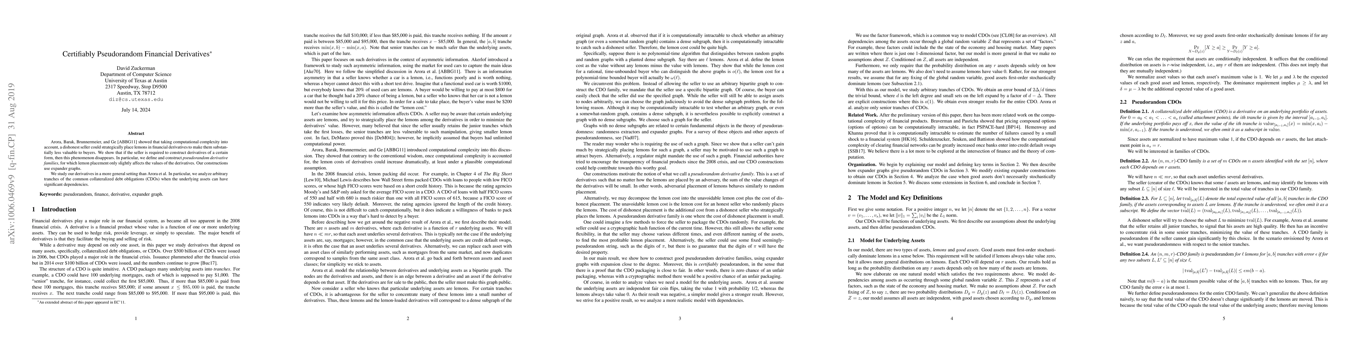 Arora, Barak, Brunnermeier, and Ge showed that taking computational complexity into account, a dishonest seller could strategically place lemons in financial derivatives to make them substantially less valuable to buyers. We show that if the seller is required to construct derivatives of a certain form, then this phenomenon disappears. In particular, we define and construct pseudorandom derivative families, for which lemon placement only slightly affects the values of the derivatives. Our constructions use expander graphs. We study our derivatives in a more general setting than Arora et al. In particular, we analyze arbitrary tranches of the common collateralized debt obligations (CDOs) when the underlying assets can have significant dependencies.