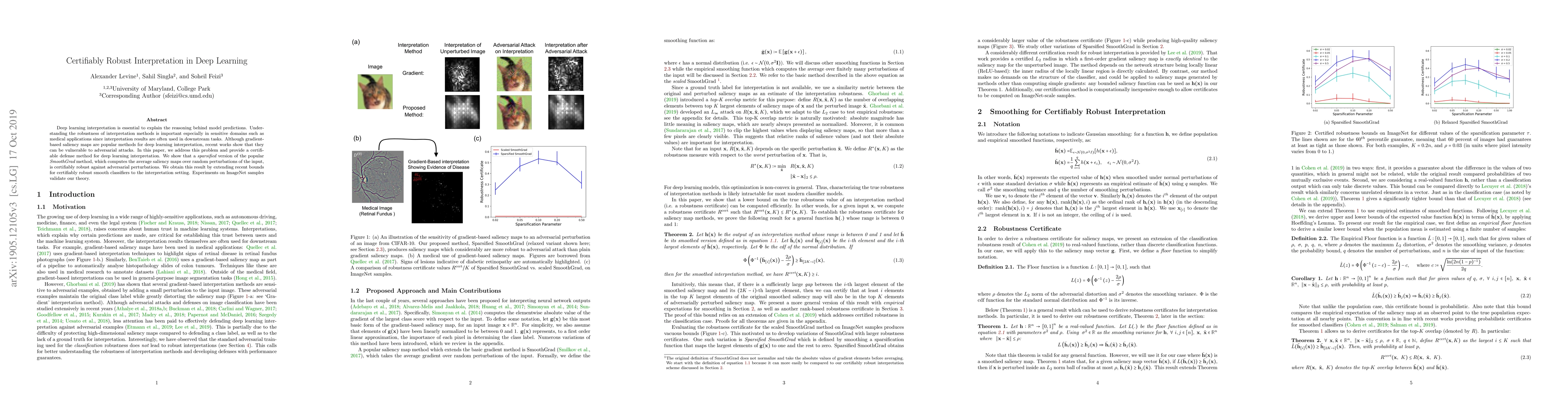 This paper proposes a certifiably robust method for deep learning interpretation using a sparsified version of SmoothGrad, demonstrating its robustness against adversarial attacks. Experiments on ImageNet confirm the theoretical robustness of the proposed method.