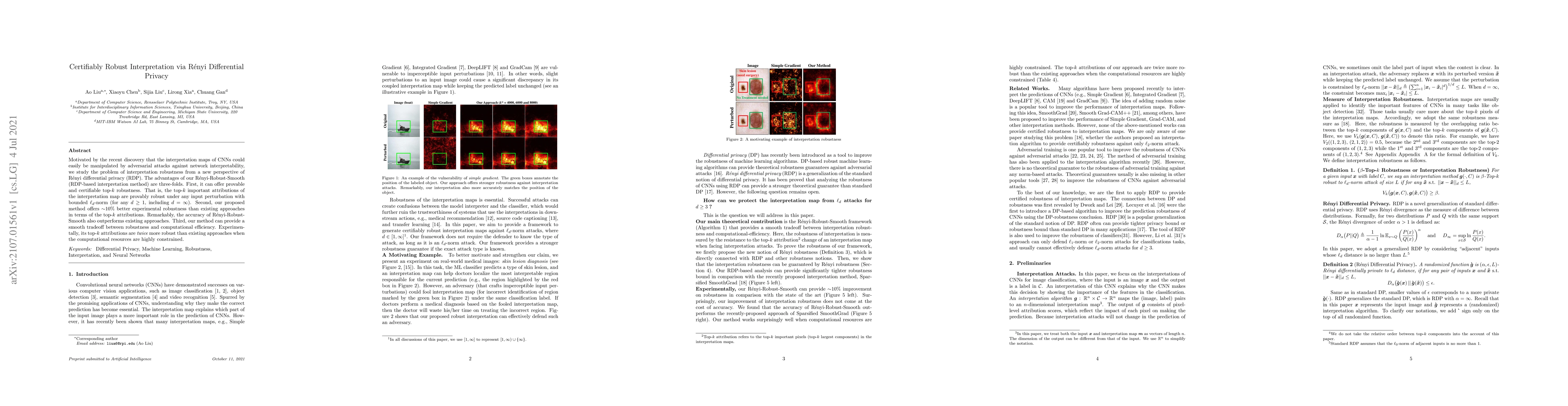 Motivated by the recent discovery that the interpretation maps of CNNs could easily be manipulated by adversarial attacks against network interpretability, we study the problem of interpretation robustness from a new perspective of \Renyi differential privacy (RDP). The advantages of our Renyi-Robust-Smooth (RDP-based interpretation method) are three-folds. First, it can offer provable and certifiable top-$k$ robustness. That is, the top-$k$ important attributions of the interpretation map are provably robust under any input perturbation with bounded $\ell_d$-norm (for any $d\geq 1$, including $d = \infty$). Second, our proposed method offers $\sim10\%$ better experimental robustness than existing approaches in terms of the top-$k$ attributions. Remarkably, the accuracy of Renyi-Robust-Smooth also outperforms existing approaches. Third, our method can provide a smooth tradeoff between robustness and computational efficiency. Experimentally, its top-$k$ attributions are {\em twice} more robust than existing approaches when the computational resources are highly constrained.