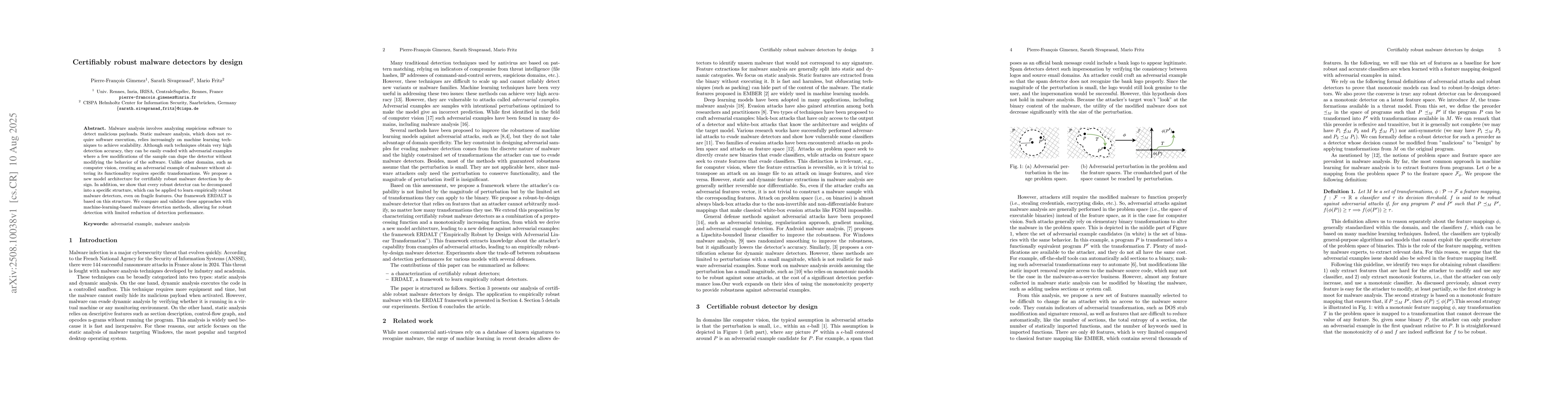 Malware analysis involves analyzing suspicious software to detect malicious payloads. Static malware analysis, which does not require software execution, relies increasingly on machine learning techniques to achieve scalability. Although such techniques obtain very high detection accuracy, they can be easily evaded with adversarial examples where a few modifications of the sample can dupe the detector without modifying the behavior of the software. Unlike other domains, such as computer vision, creating an adversarial example of malware without altering its functionality requires specific transformations. We propose a new model architecture for certifiably robust malware detection by design. In addition, we show that every robust detector can be decomposed into a specific structure, which can be applied to learn empirically robust malware detectors, even on fragile features. Our framework ERDALT is based on this structure. We compare and validate these approaches with machine-learning-based malware detection methods, allowing for robust detection with limited reduction of detection performance.