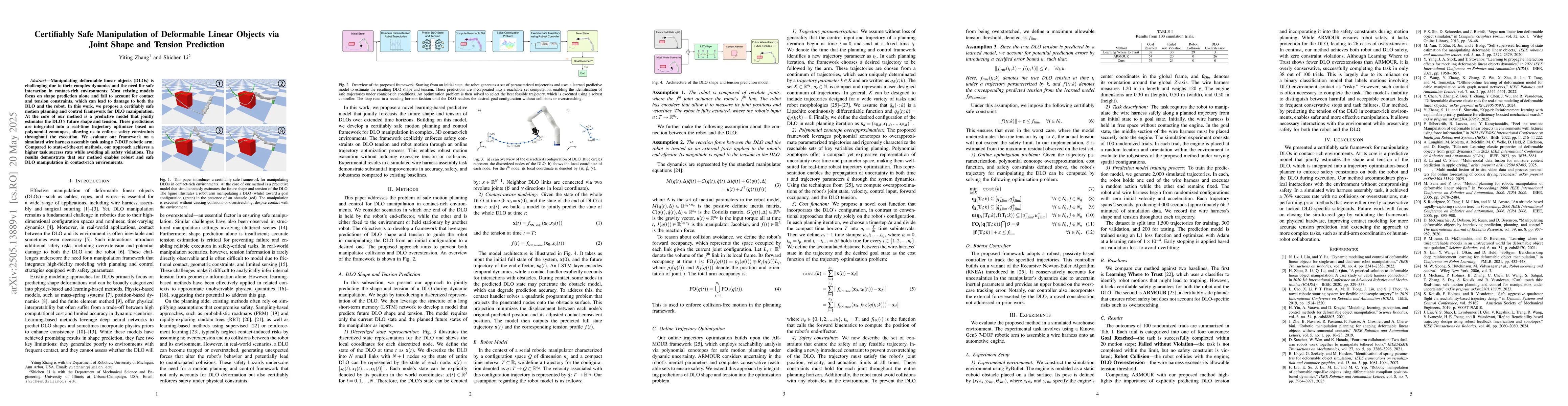 The research proposes a certifiably safe motion planning and control framework for deformable linear objects (DLO) manipulation, utilizing a predictive model that jointly estimates DLO's future shape and tension, integrated into a real-time trajectory optimizer based on polynomial zonotopes for safety constraint enforcement.