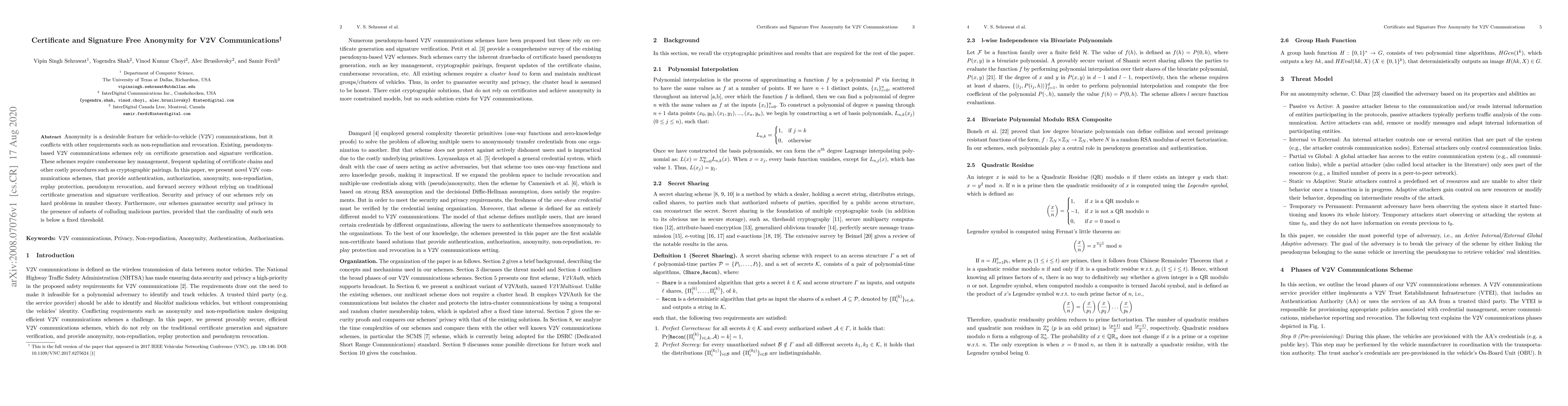 Anonymity is a desirable feature for vehicle-to-vehicle (V2V) communications, but it conflicts with other requirements such as non-repudiation and revocation. Existing, pseudonym-based V2V communications schemes rely on certificate generation and signature verification. These schemes require cumbersome key management, frequent updating of certificate chains and other costly procedures such as cryptographic pairings. In this paper, we present novel V2V communications schemes, that provide authentication, authorization, anonymity, non-repudiation, replay protection, pseudonym revocation, and forward secrecy without relying on traditional certificate generation and signature verification. Security and privacy of our schemes rely on hard problems in number theory. Furthermore, our schemes guarantee security and privacy in the presence of subsets of colluding malicious parties, provided that the cardinality of such sets is below a fixed threshold.