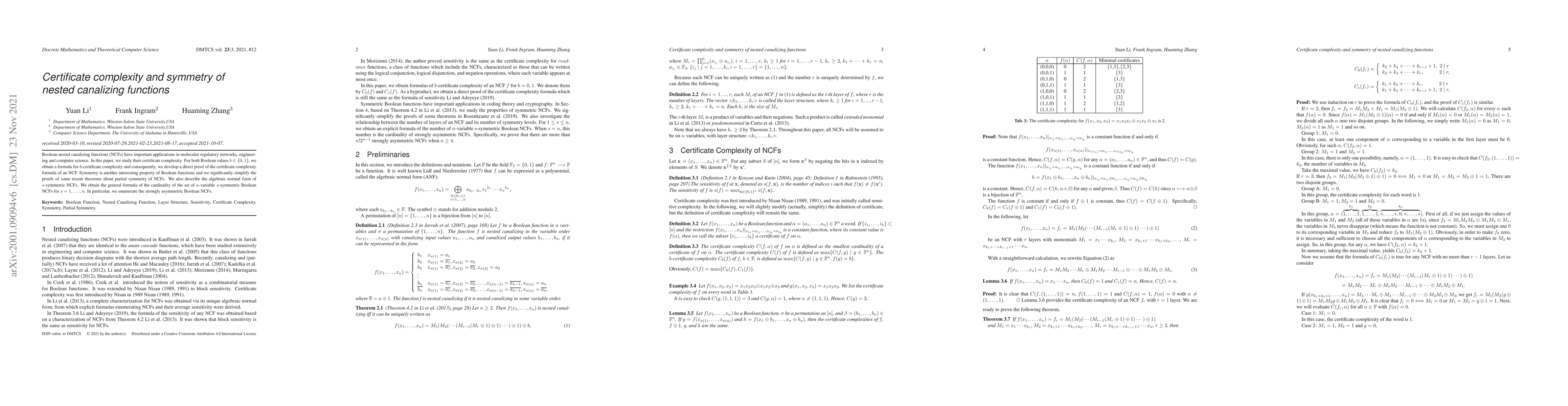 Boolean nested canalizing functions (NCFs) have important applications in molecular regulatory networks, engineering and computer science. In this paper, we study their certificate complexity. For both Boolean values $b\in\{0,1\}$, we obtain a formula for $b$-certificate complexity and consequently, we develop a direct proof of the certificate complexity formula of an NCF. Symmetry is another interesting property of Boolean functions and we significantly simplify the proofs of some recent theorems about partial symmetry of NCFs. We also describe the algebraic normal form of $s$-symmetric NCFs. We obtain the general formula of the cardinality of the set of $n$-variable $s$-symmetric Boolean NCFs for $s=1,\dots,n$. In particular, we enumerate the strongly asymmetric Boolean NCFs.