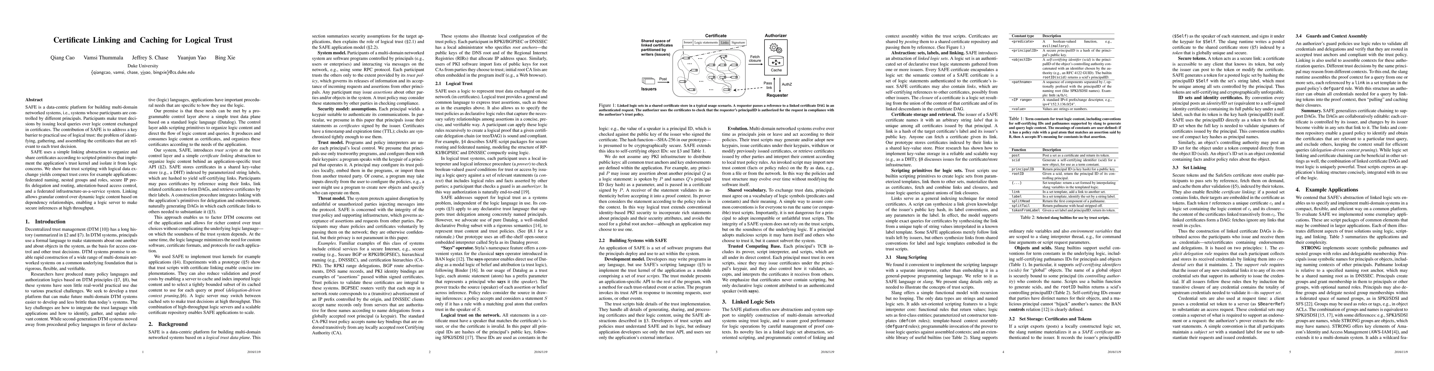 SAFE introduces a data-centric platform for multi-domain networked systems, addressing the challenge of certificate management for logical trust through linking and caching. It employs trust scripting to create compact trust cores for various applications, enabling efficient and secure trust decisions.