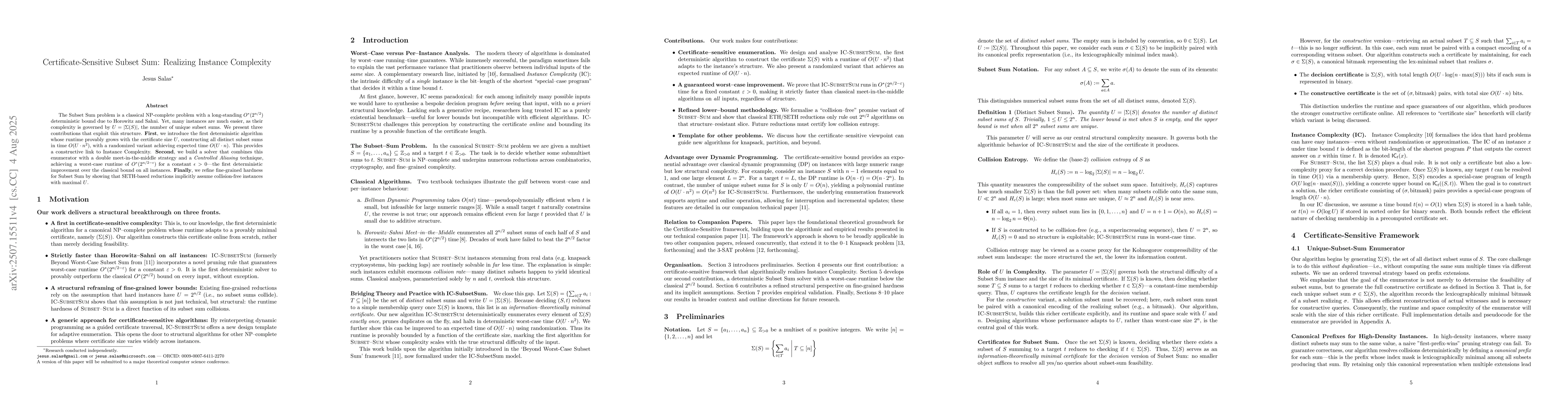 We present, to our knowledge, the first deterministic, certificate-sensitive algorithm for a canonical NP-complete problem whose runtime provably adapts to the structure of each input. For a Subset-Sum instance $(S, t)$, let $\Sigma(S)$ denote the set of distinct subset sums and define $U = |\Sigma(S)|$. This set serves as an information-theoretically minimal witness, the instance-complexity (IC) certificate. Our solver, IC-SubsetSum, enumerates every element of $\Sigma(S)$ in deterministic time $O(U \cdot n^2)$ and space $O(U \cdot n)$. A randomized variant achieves expected runtime $O(U \cdot n)$. The algorithm's complexity is thus directly governed by the certificate size, and this structure-sensitive performance is paired with a guaranteed worst-case runtime of $O^*(2^{n/2 - \varepsilon})$ for some constant $\varepsilon > 0$, the first such result to strictly outperform classical methods on every instance. We revisit fine-grained reductions that rely on the classical $2^{n/2}$ hardness of SubsetSum and show that these arguments hold only for collision-free instances where $U$ is maximal. IC-SubsetSum reframes this barrier structurally and introduces a new paradigm for certificate-sensitive algorithms across NP-complete problems.