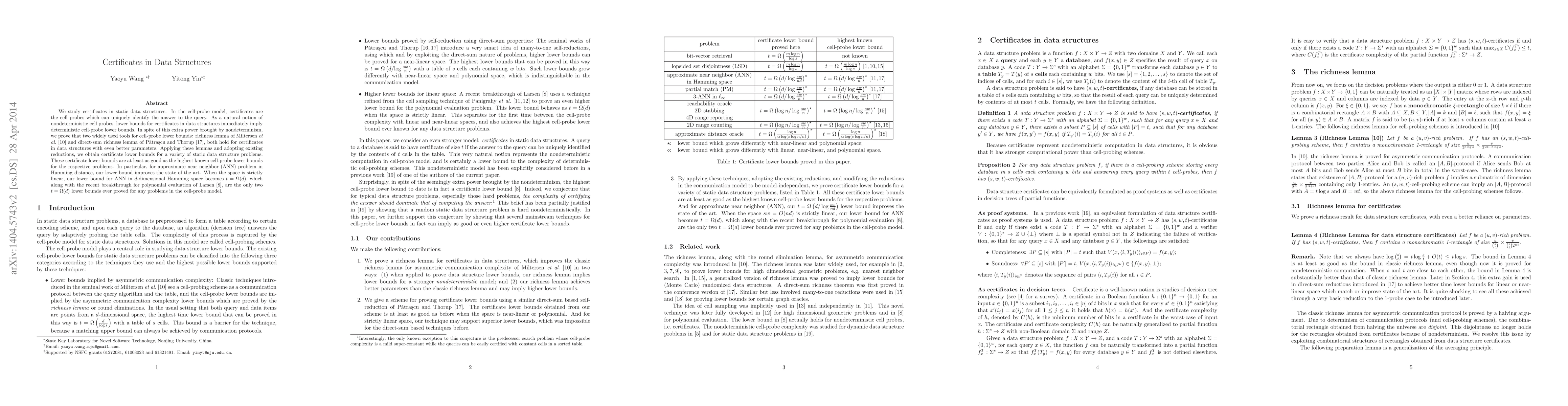Researchers prove that certificates in static data structures can achieve better parameters than existing cell-probe lower bounds for various problems, including approximate near neighbor search, improving the state of the art in some cases.