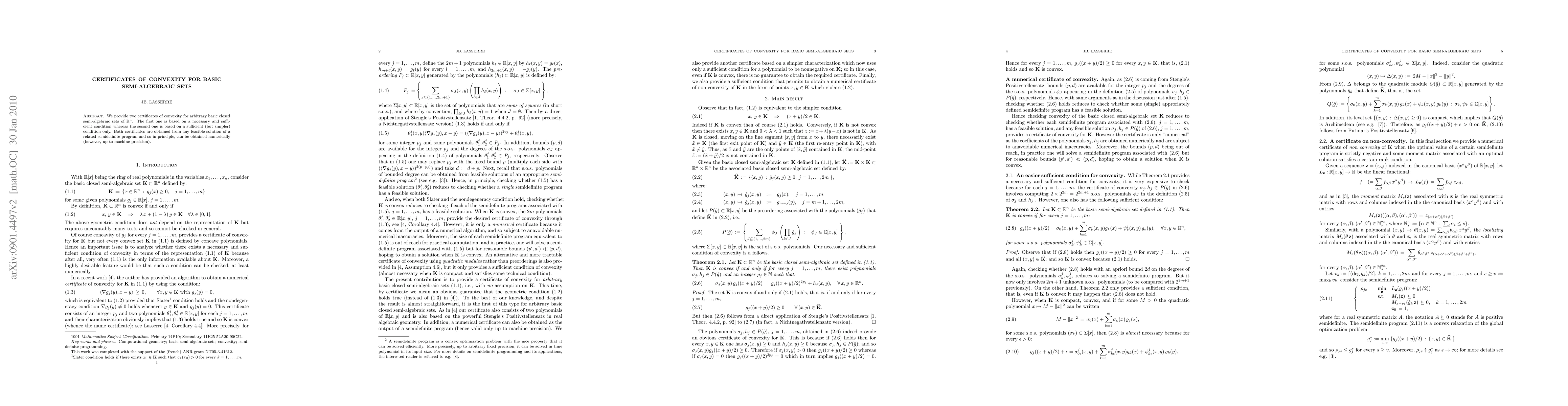 This paper presents two convexity certificates for basic semi-algebraic sets in $\R^n$: a necessary and sufficient condition and a simpler sufficient condition, both derived from feasible solutions of a related semidefinite program, allowing for numerical computation.