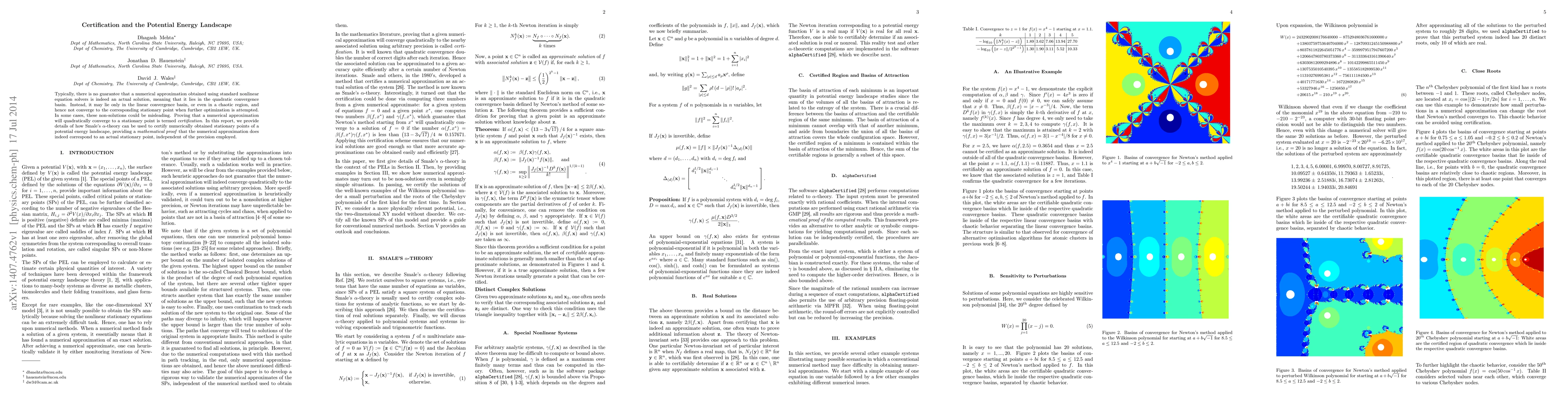 This paper discusses the use of Smale's u03a9-theory for certifying numerical solutions in potential energy landscapes, providing mathematical proof that approximations correspond to actual stationary points, regardless of precision. It emphasizes the importance of ensuring solutions lie within the quadratic convergence basin, avoiding misleading non-solutions in optimization processes.