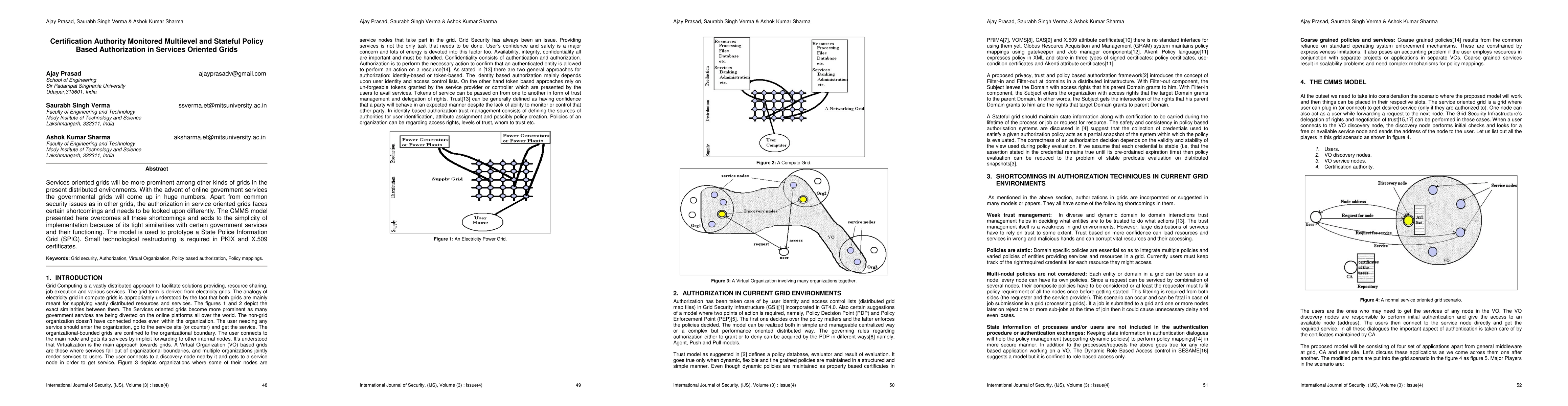 The paper proposes a Certification Authority Monitored Multilevel and Stateful Policy Based Authorization (CMMS) model to address authorization challenges in service-oriented grids, particularly for governmental grids. The CMMS model simplifies implementation and is demonstrated through a prototype State Police Information Grid (SPIG), requiring minor adjustments to PKIX and X.509 certificates.
